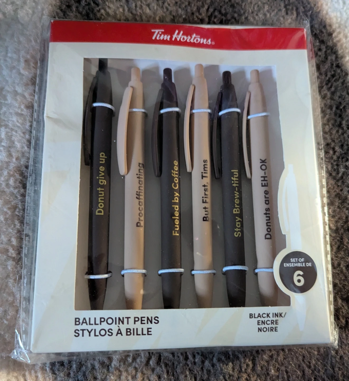 Selling a brand new set of Tim Hortons ballpoint pens! This set includes 6 pens with black ink. Each pen has a fun saying like "Donut give up" and "Fueld by Coffee". Perfect for any Tim Hortons fan!