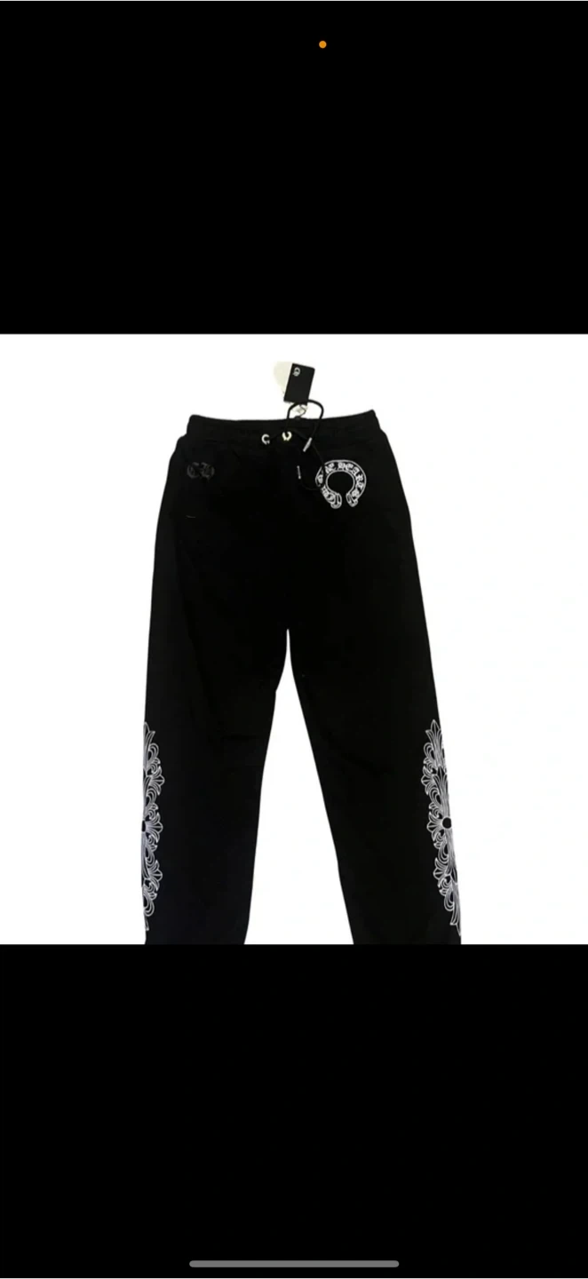 10Selling a pair of Chrome Hearts black sweatpants. They feature a unique design on the sides and the iconic Chrome Hearts logo. Great for casual wear!