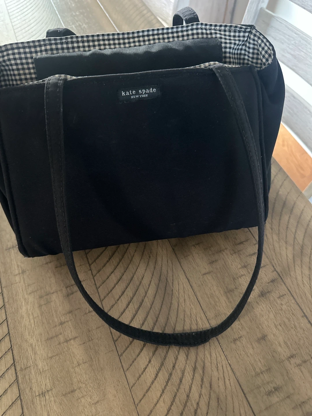 Selling a Kate Spade tote bag in black. It's in good condition and features a cute gingham lining inside! Is flimsy on its own but holds food and containers well