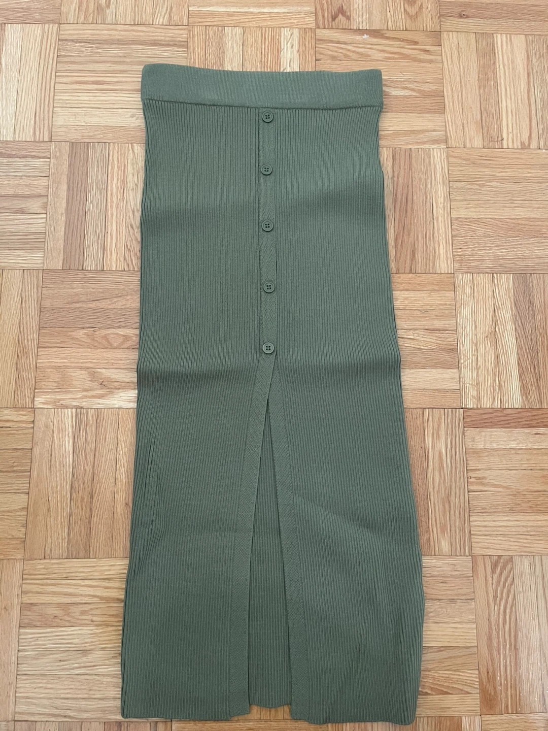 10A stylish Fashion Nova olive green knit skirt with a button-down front and a slit. The back goes a bit below knees. It is very stretchy and comfortable. Size small. Brand new.