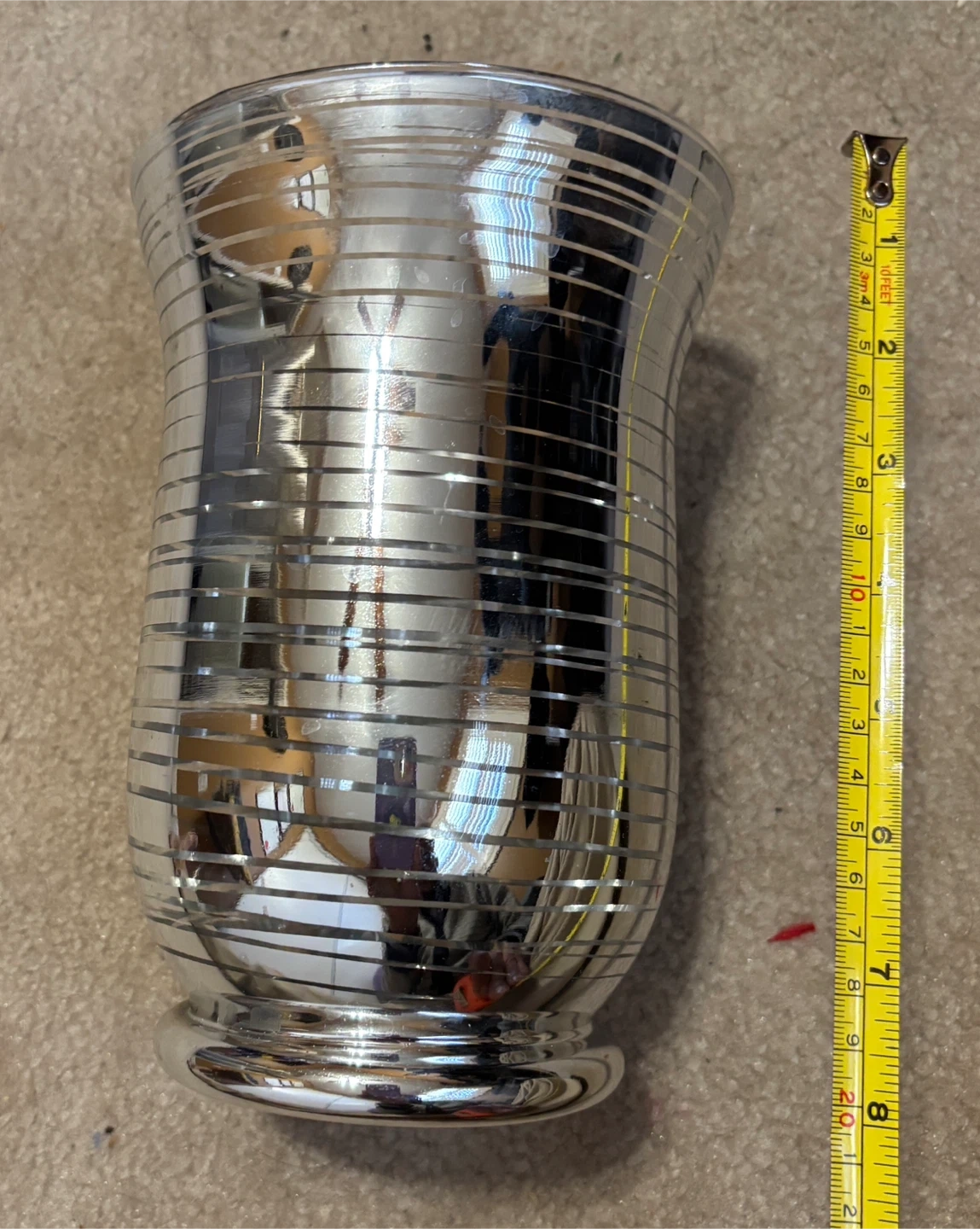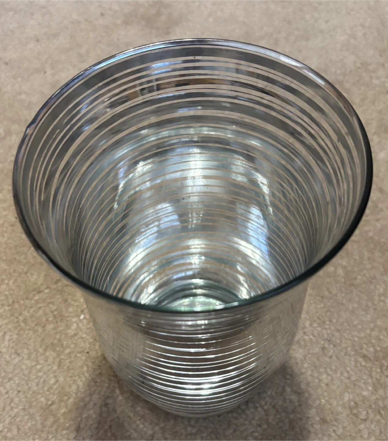Here's a lovely silver striped glass vase! It's in great shape and would look great with flowers or as a decorative piece