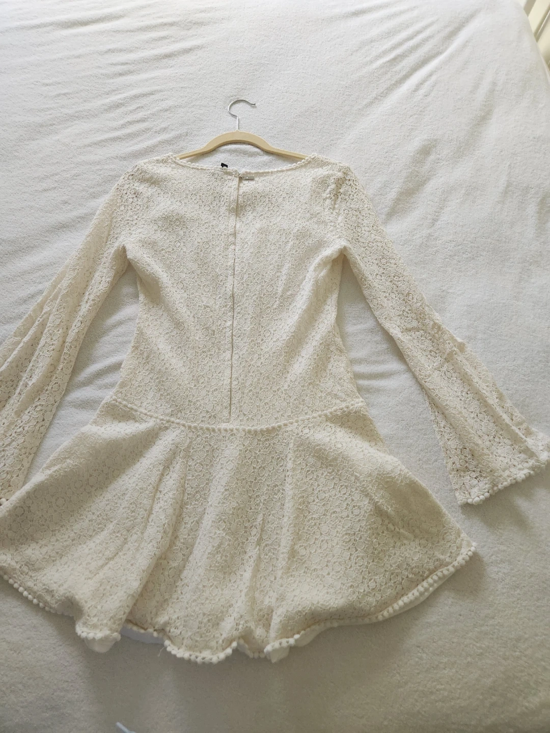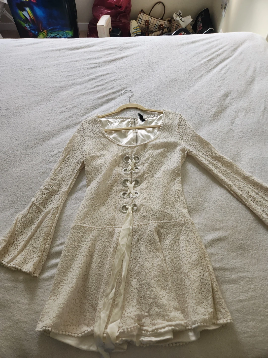 60Selling a cute Guess Marciano lace mini dress in size medium. It's a beautiful cream/off-white colour and features long sleeves and a unique lace-up detail on the front. Perfect for a night out or a special occasion!