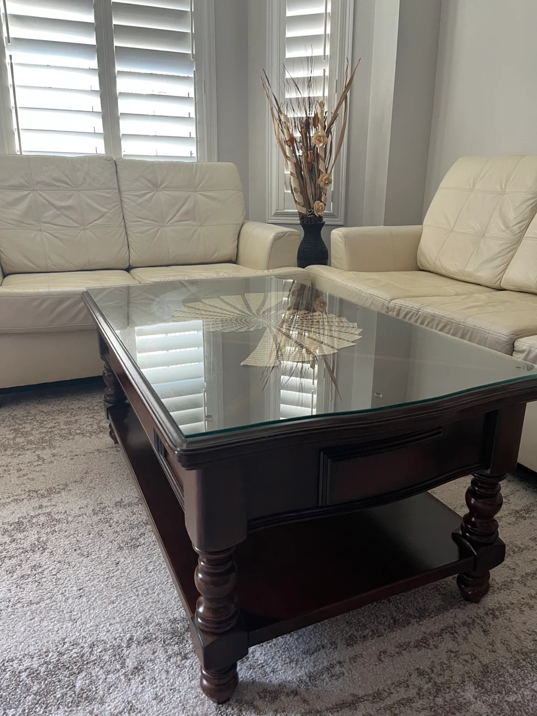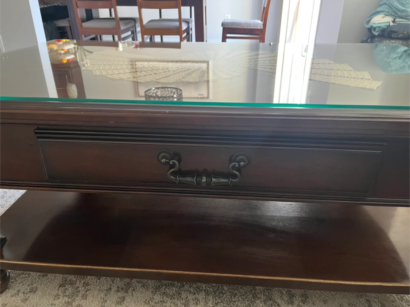 Selling a coffee table with a glass top and dark wood frame. It has a lower shelf for storage and a small drawer. It's in new condition and would look amazing in any living room