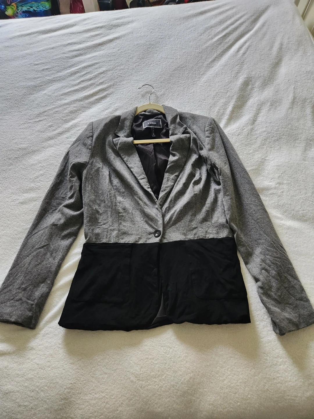 Selling a stylish blazer from Le Chateau! It features a unique two-tone design with a grey upper and black lower section. The size is M/M, so it should fit a medium build. It's in great condition and ready for a new home!