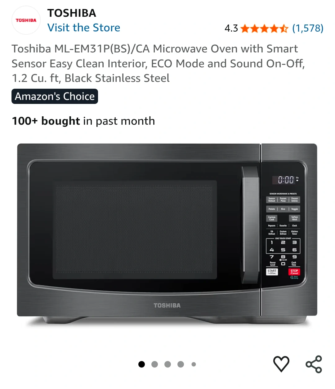 91Selling a Toshiba ML-EM31P(BS)/CA microwave oven in black stainless steel. It is 1.2 Cu. ft. Current price is 190+tax in Amazon. Selling because I moved and my current place has a built-in Microwave.