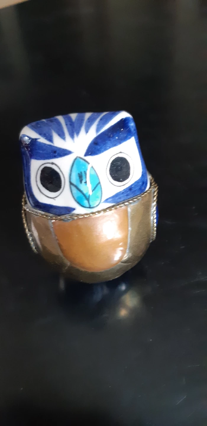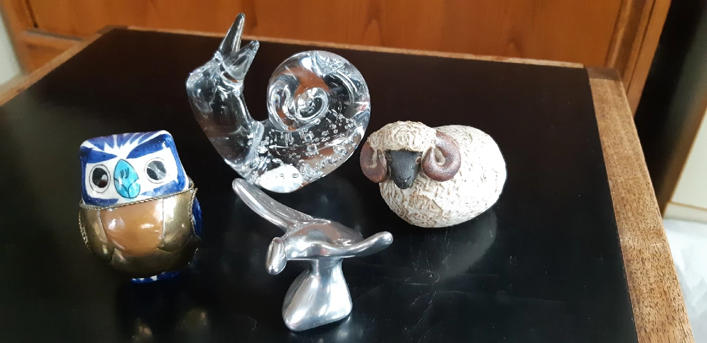 8401. Gorgeous glass snail 2. Handcrafted ceramic ram (stamped) 3. Handcrafted aluminum Canada goose by Hoselton (signed) 4. Ceramic/metal owl A charming menagerie that would look great on a shelf or desk!