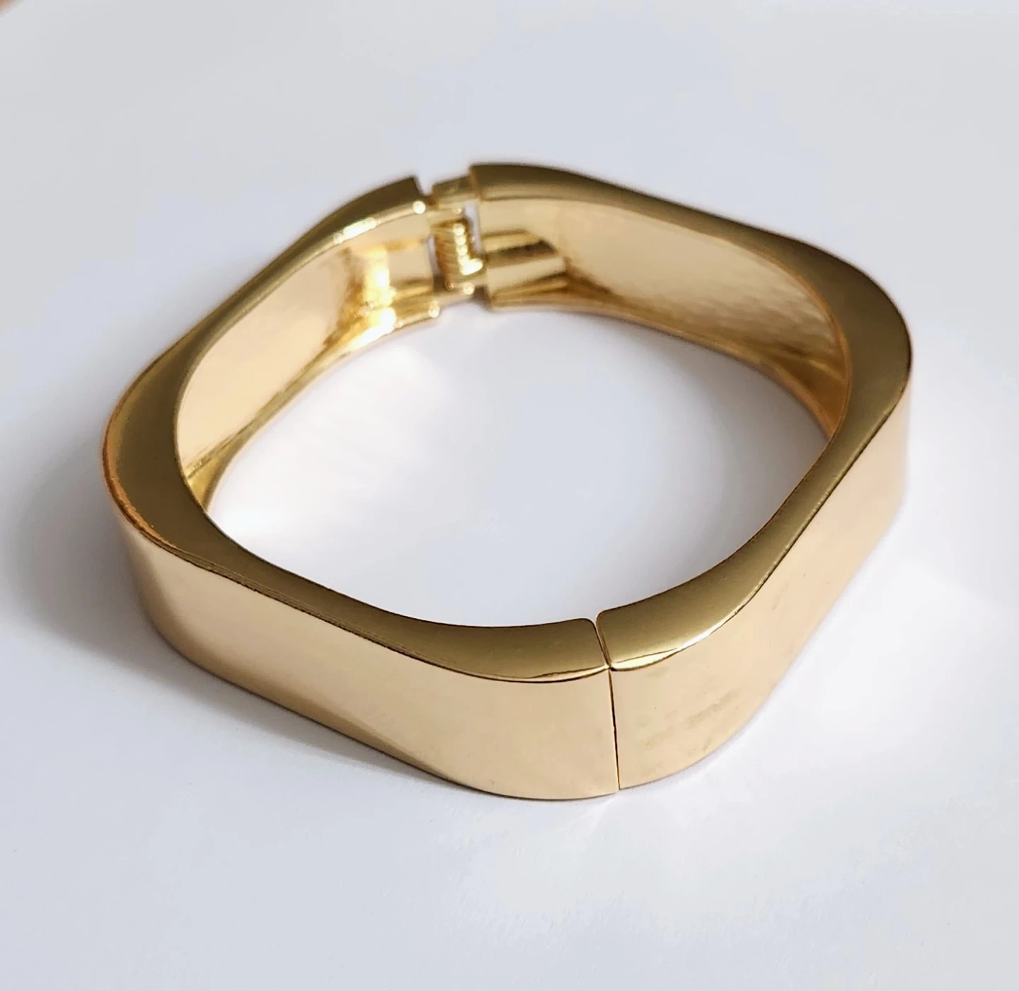 Gorgeous square-shaped gold bracelet with a shiny finish and hinged opening. It’s sturdy, elegant, and looks amazing with both casual and dressy outfits!