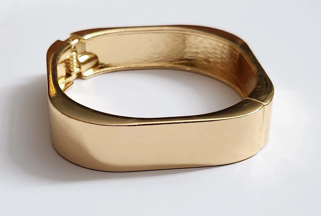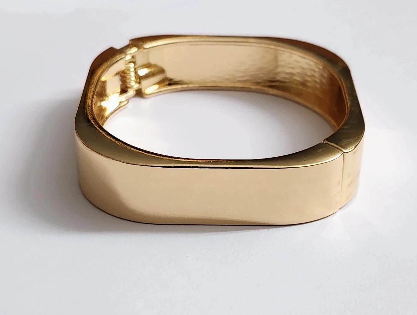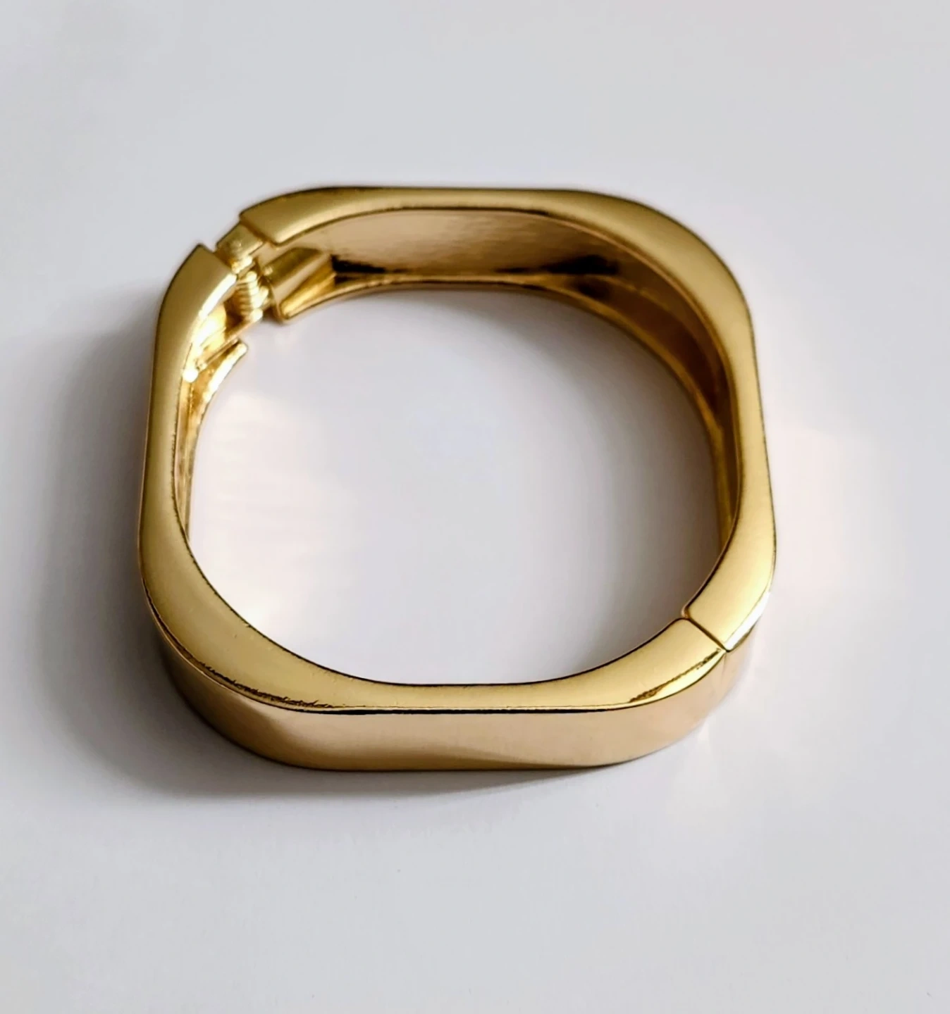 Gorgeous square-shaped gold bracelet with a shiny finish and hinged opening. It’s sturdy, elegant, and looks amazing with both casual and dressy outfits!