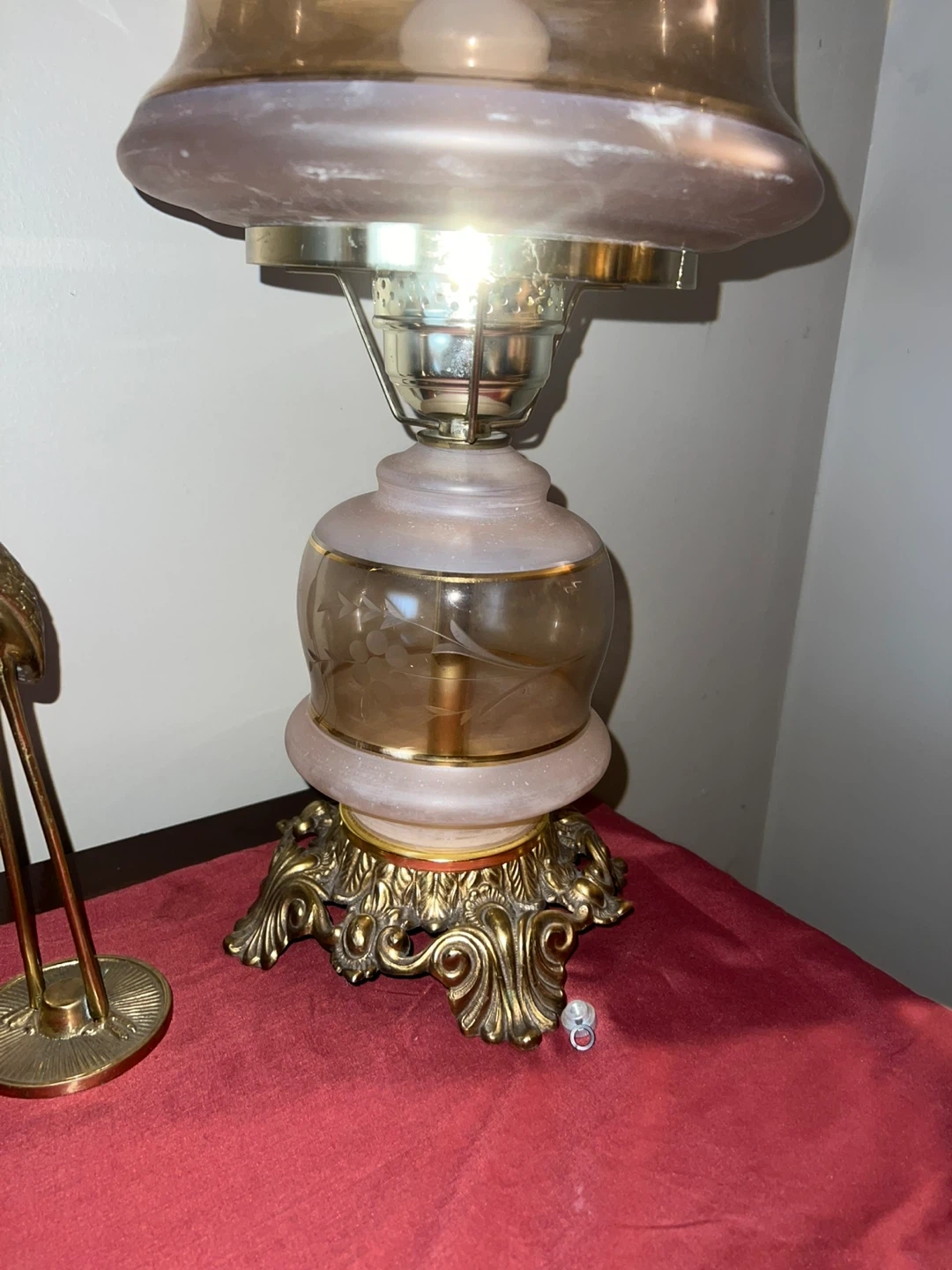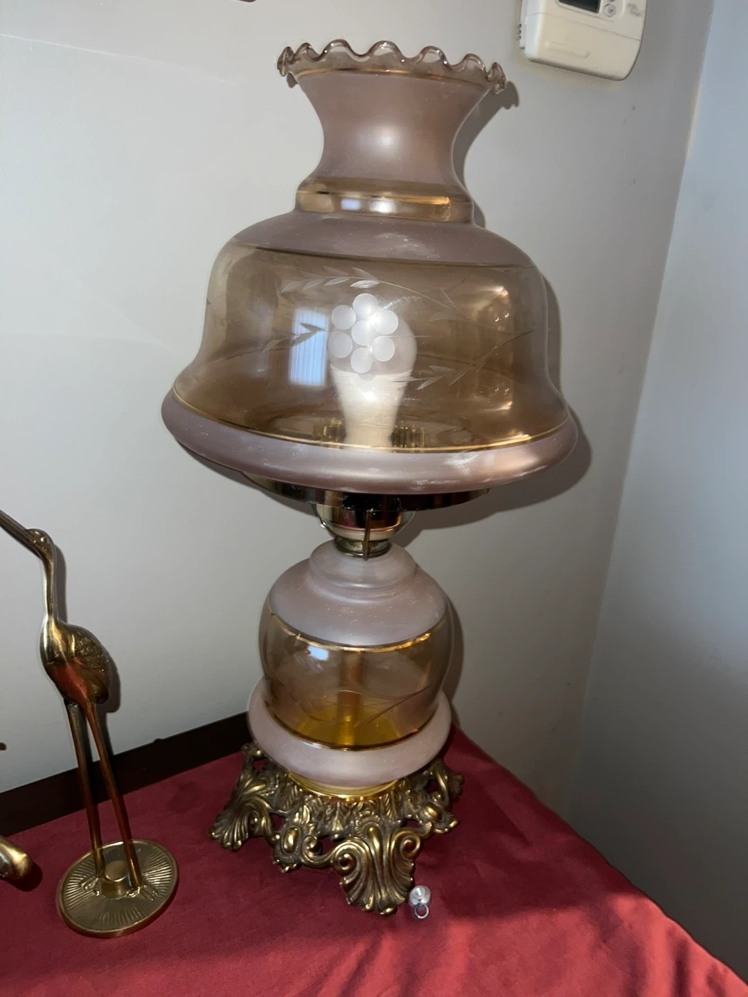 Selling a beautiful vintage hurricane table lamp! It features a unique design with a glass shade and ornate metal base. This lamp would add a touch of elegance to any room.
