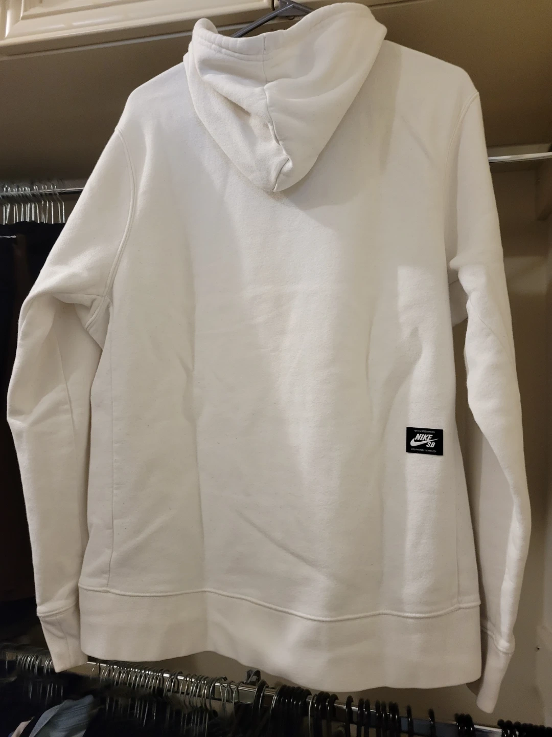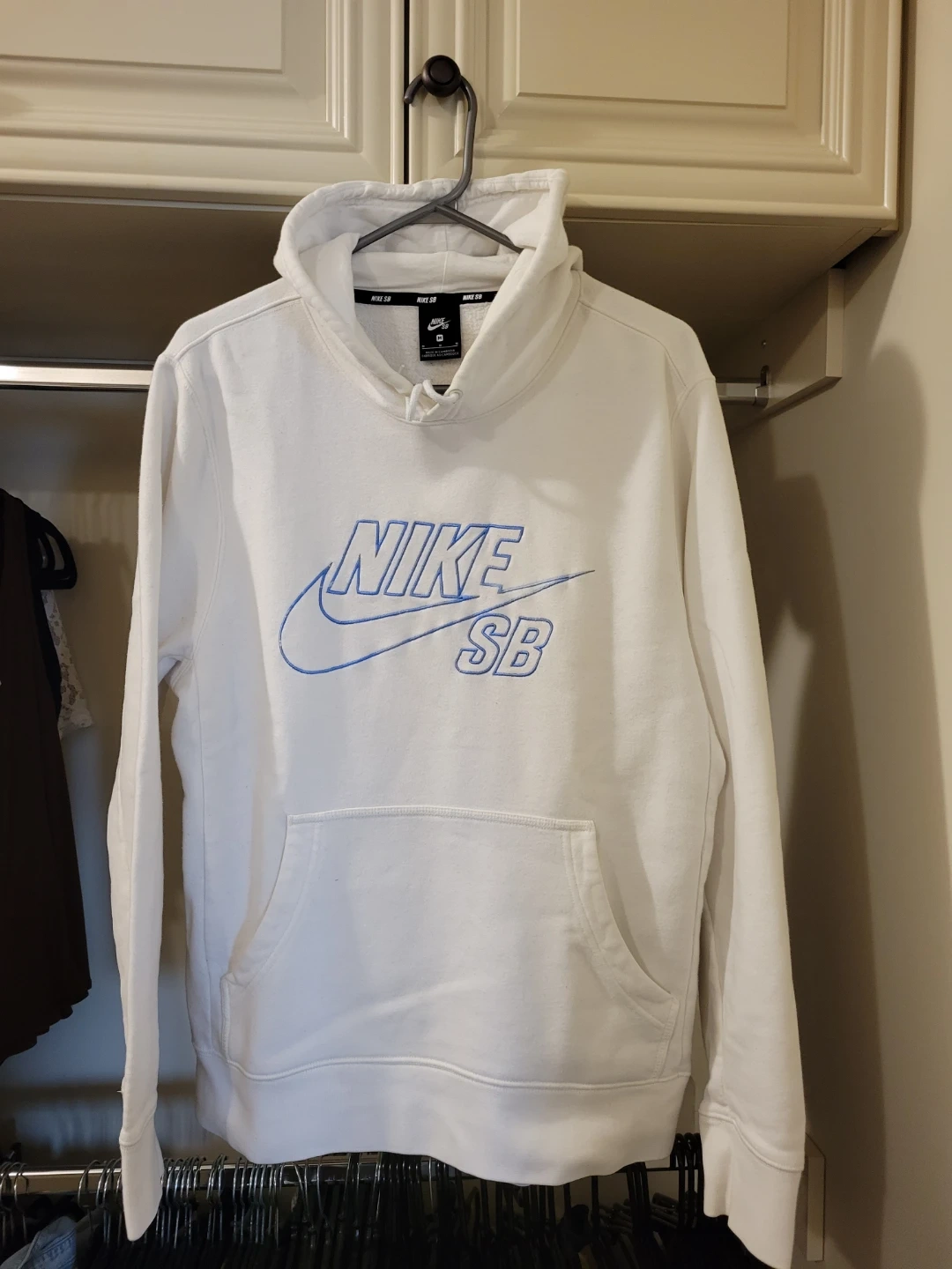 Selling a Nike SB hoodie in white! The hoodie features the Nike SB logo in blue on the front. It's in great condition and ready for a new home