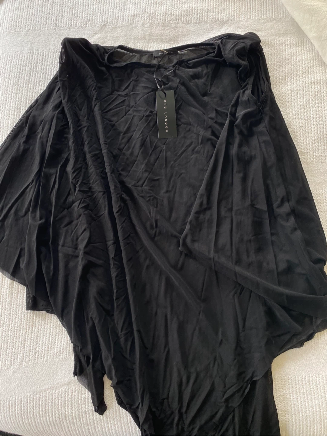 QED London black top with tags! It is in the style of a shawl, but it has arm holes so the arms are exposed(so it’s not quite a shawl). It’s very flowy and has small shoulder pads.