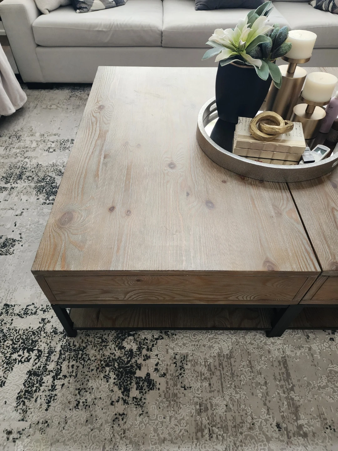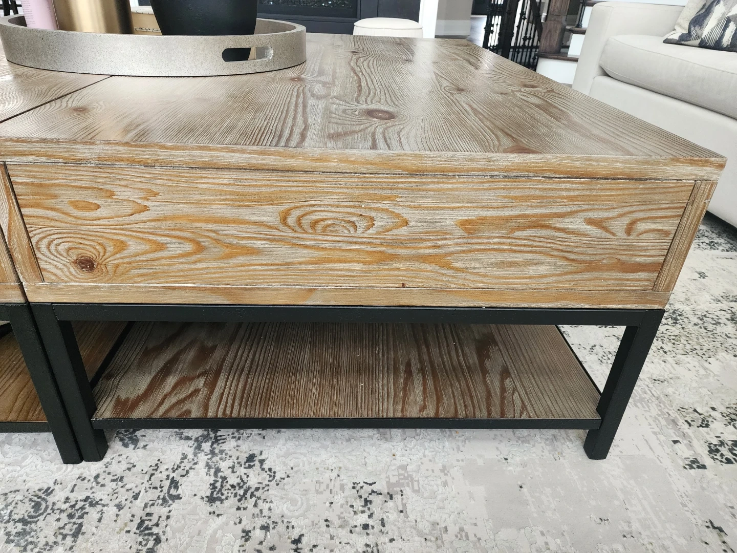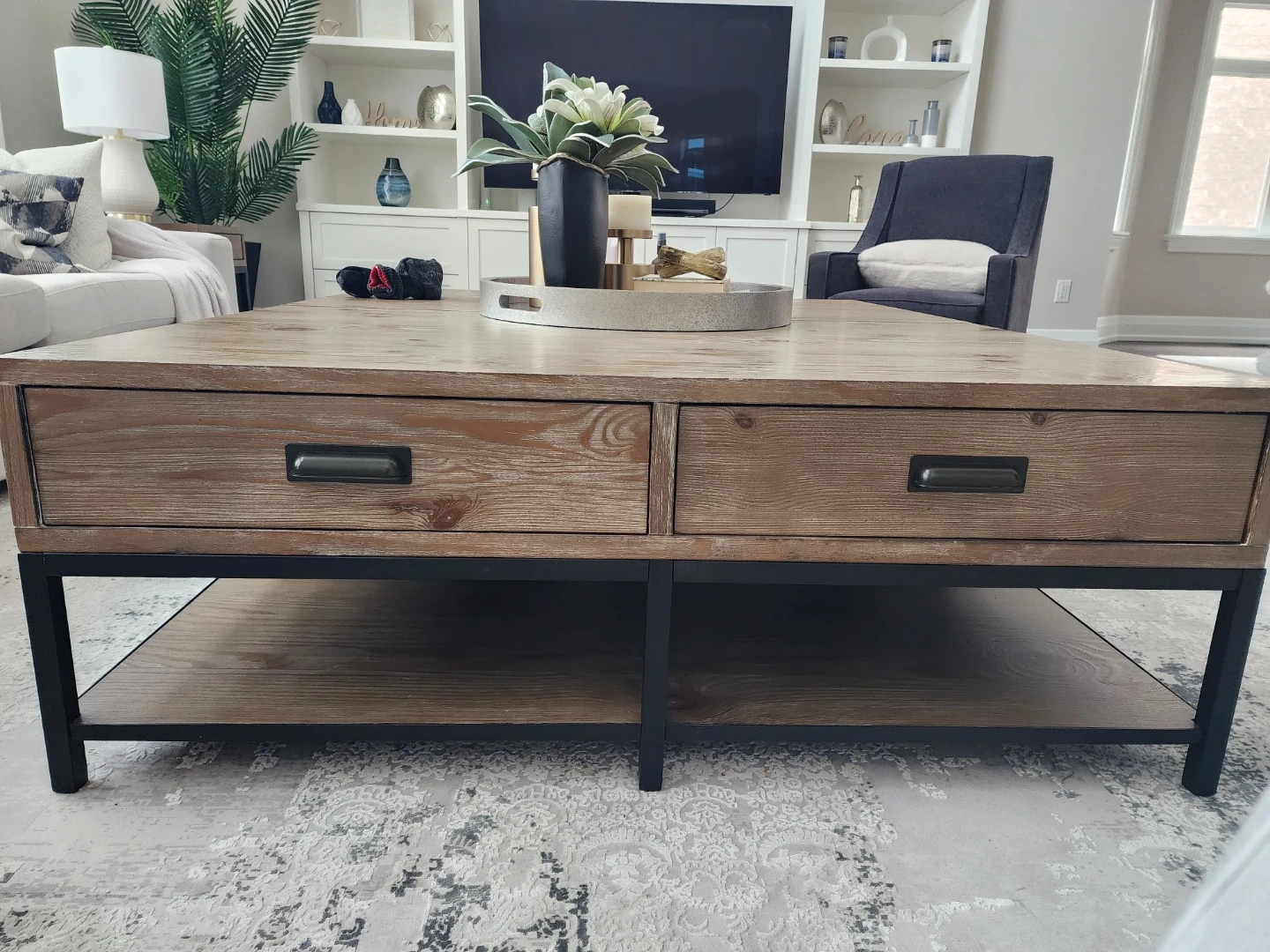 Selling a coffee table with a wood top and metal base. It has two drawers for storage and a shelf underneath. It's in great condition and would look great in any living room