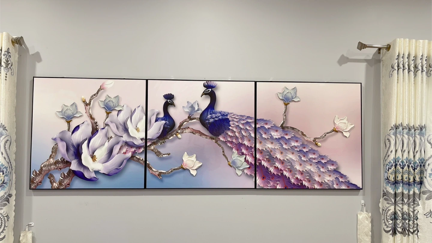 Beautiful peacock wall art, consisting of three panels that create a stunning triptych. It's a great way to add a touch of elegance to any room!