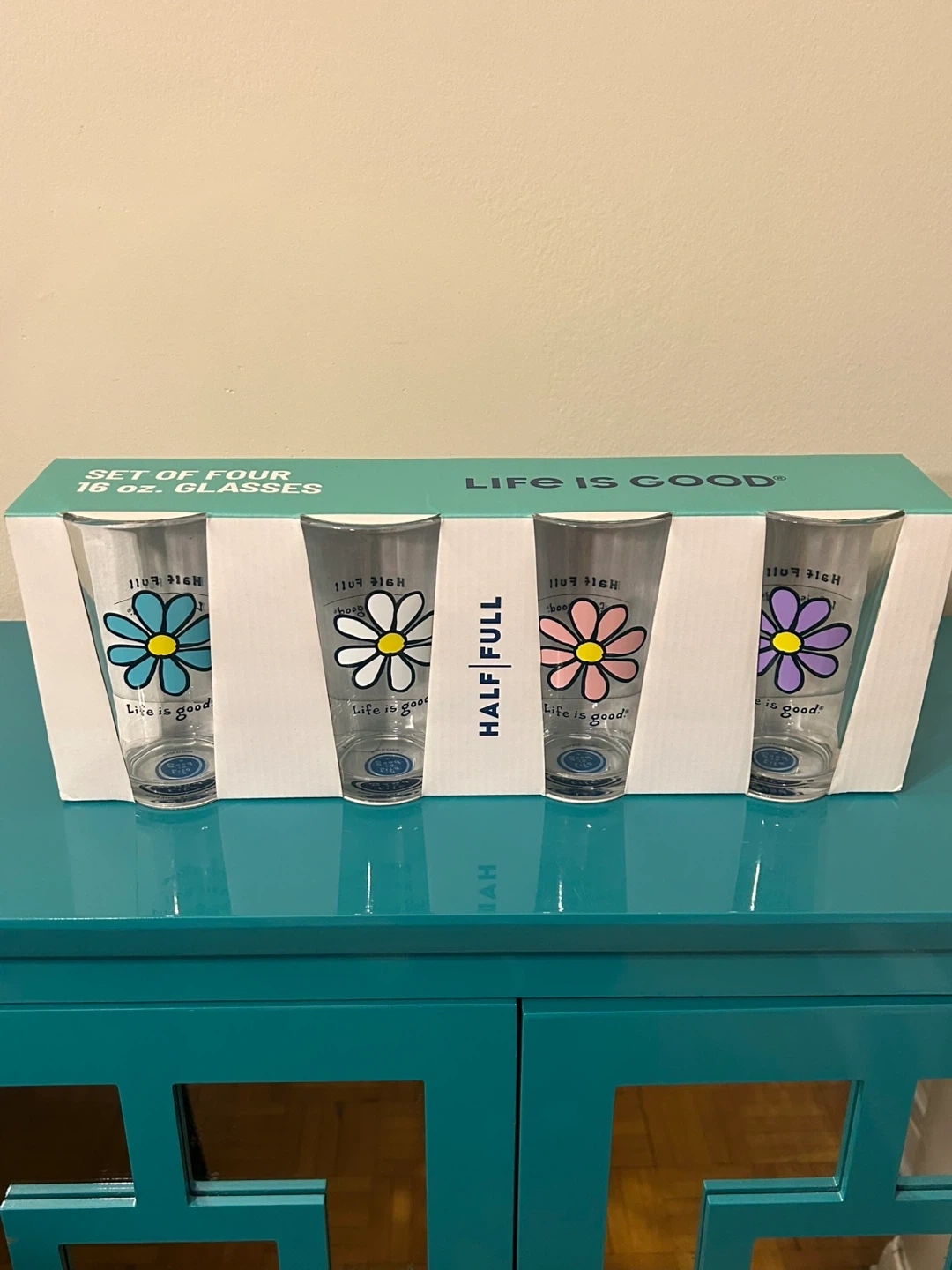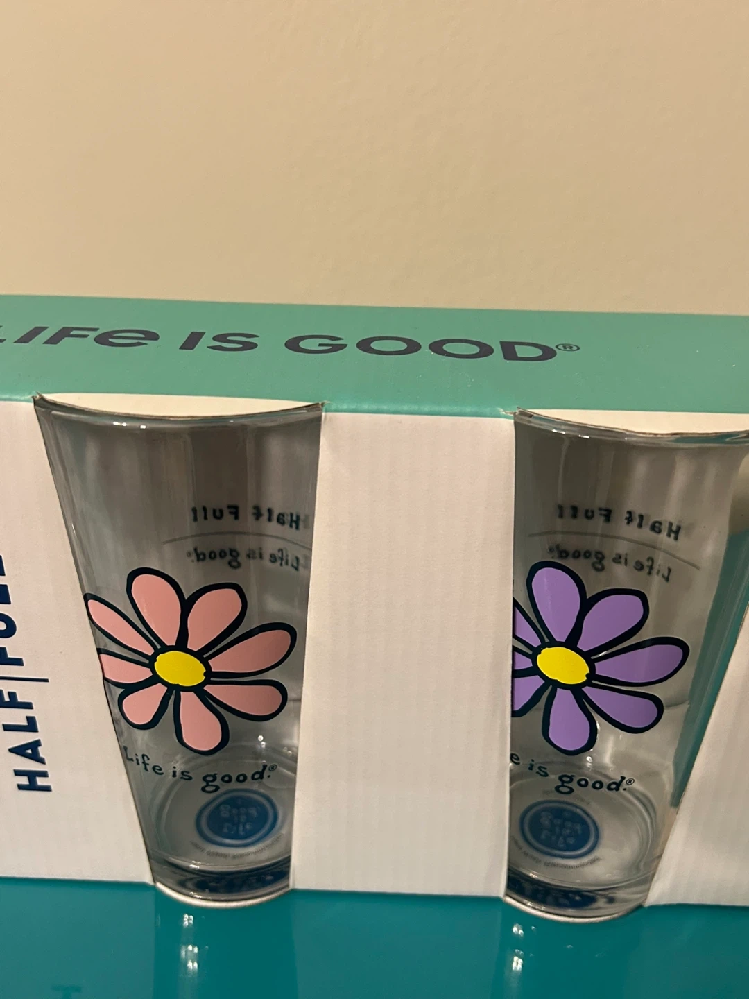 Each glass features a colorful daisy and uplifting “Half Full” design — perfect for everyday use or gifting.