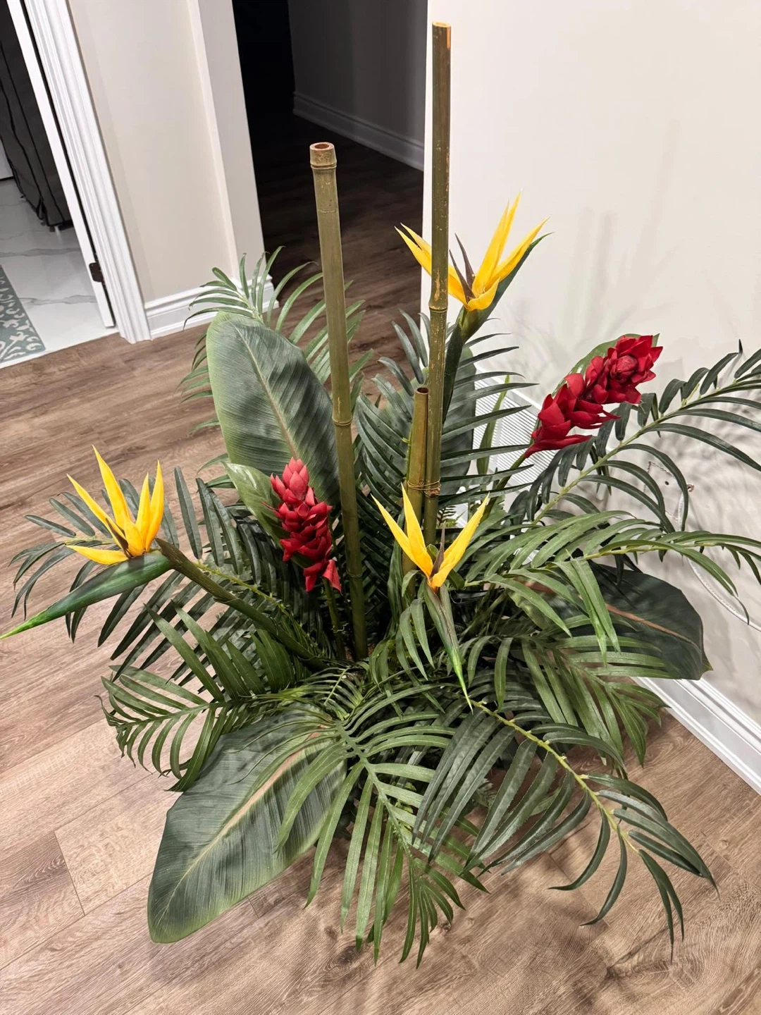 This is a beautiful artificial floral arrangement, perfect for adding a touch of the tropics to your home! It features vibrant yellow and red flowers, along with lush green foliage and bamboo stalks. It's in great condition and ready to brighten up any space