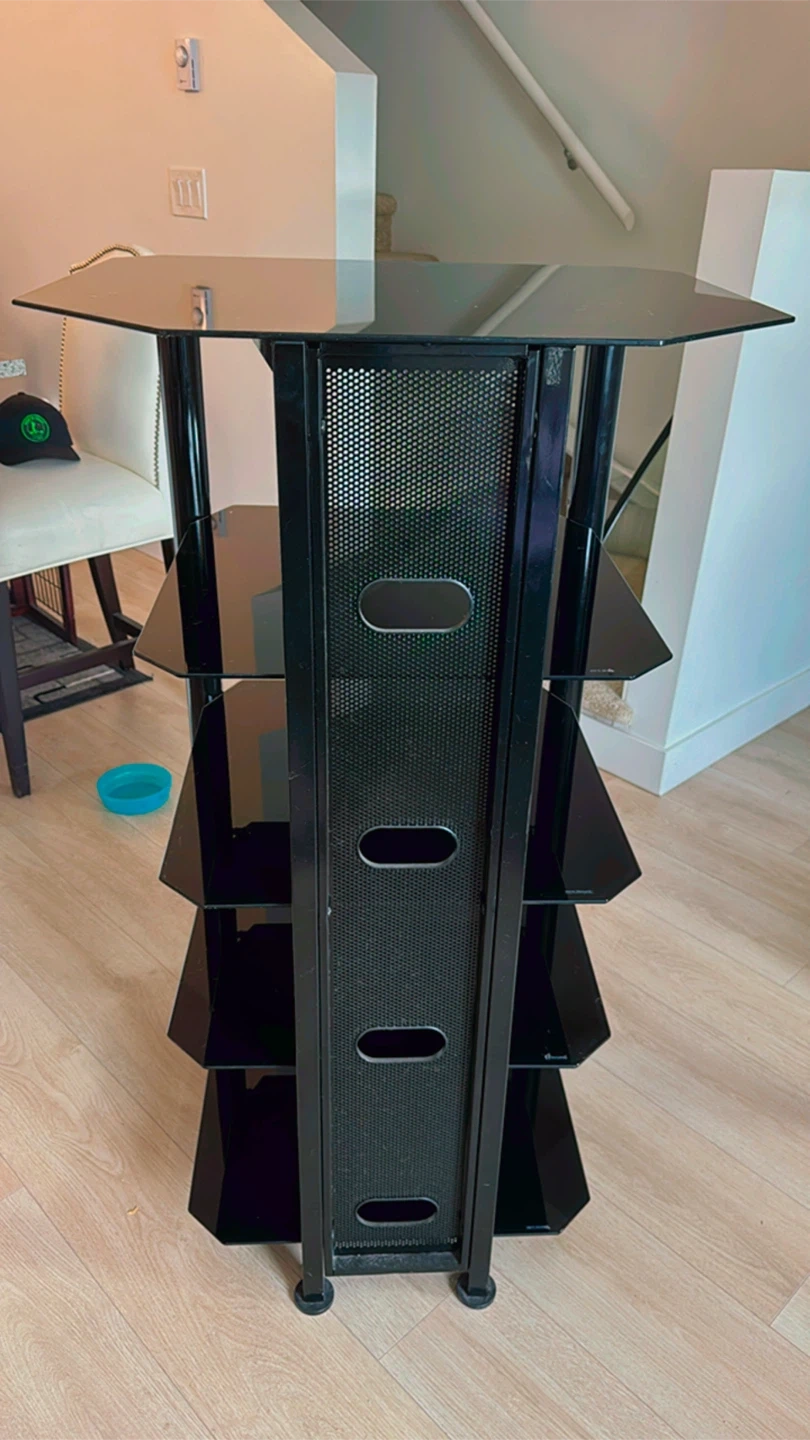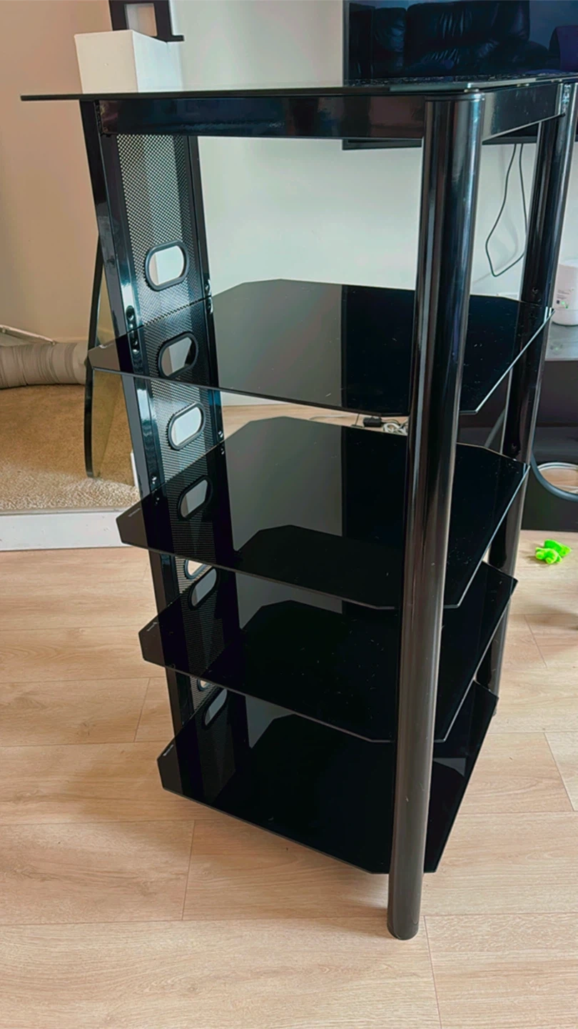 Selling a black glass shelf unit! It's in great shape and perfect for displaying your favourite items or media components. It has a sleek design that would look great in any living room, bedroom, or office space. If you're interested, send me a message!