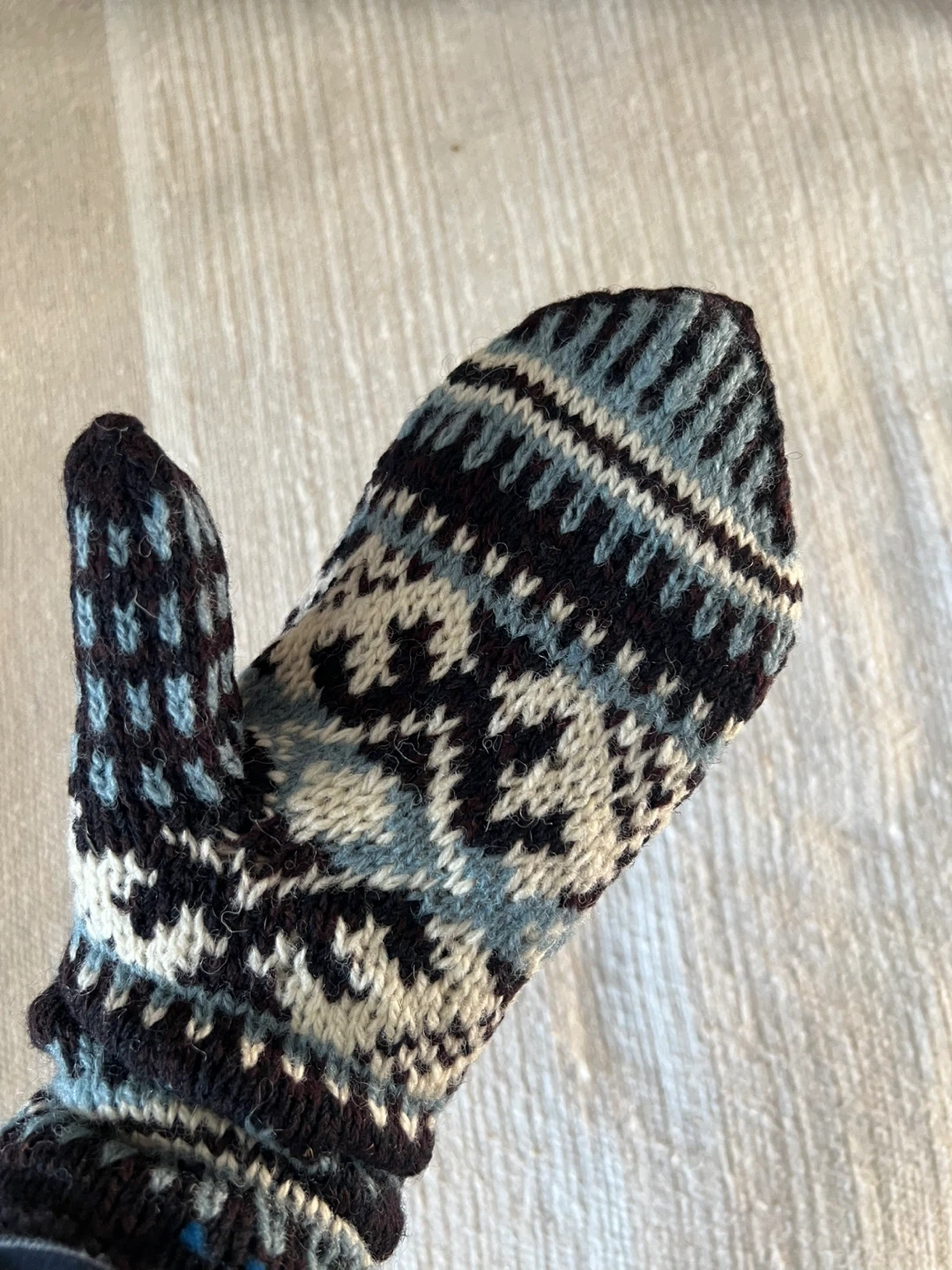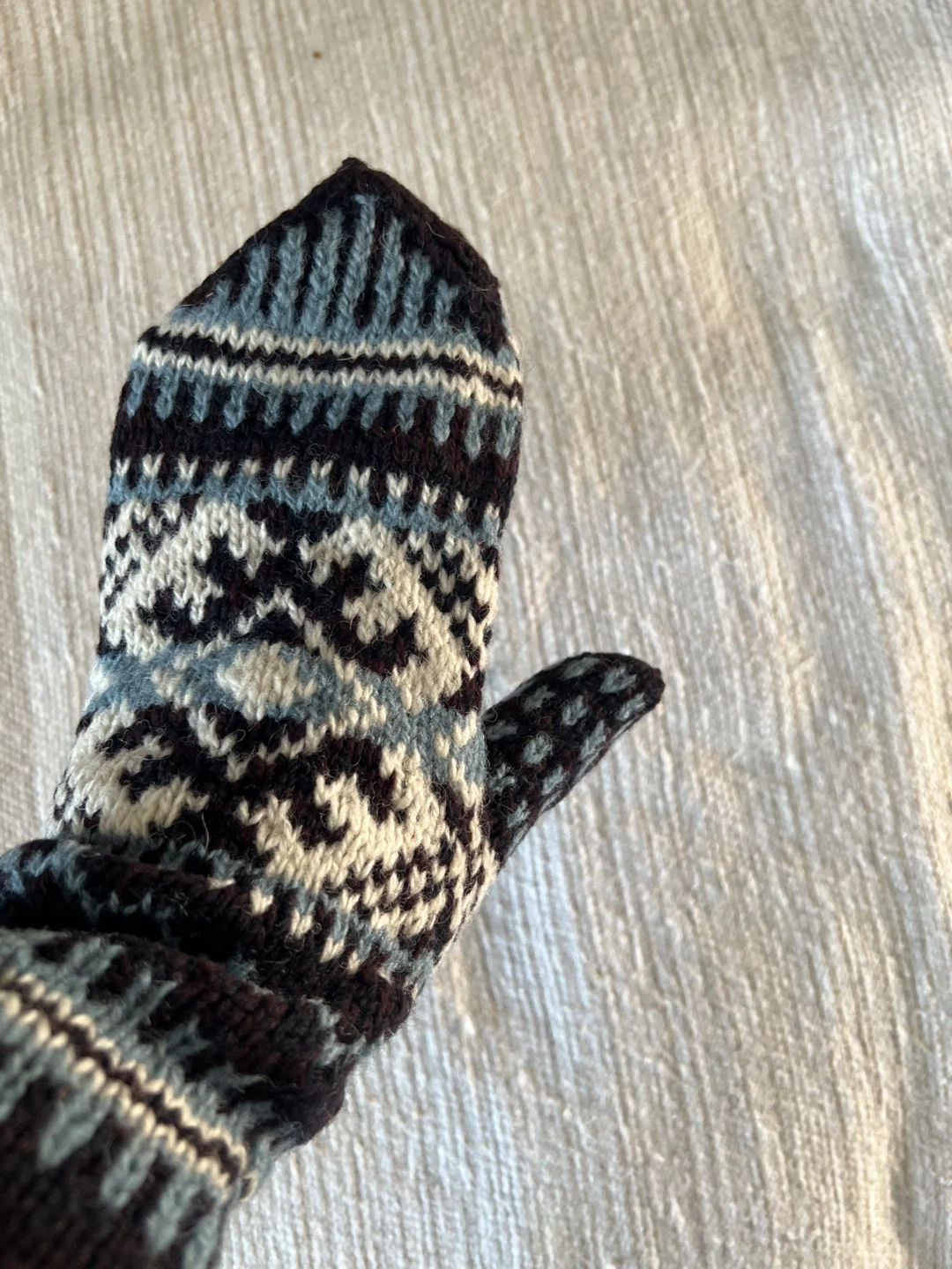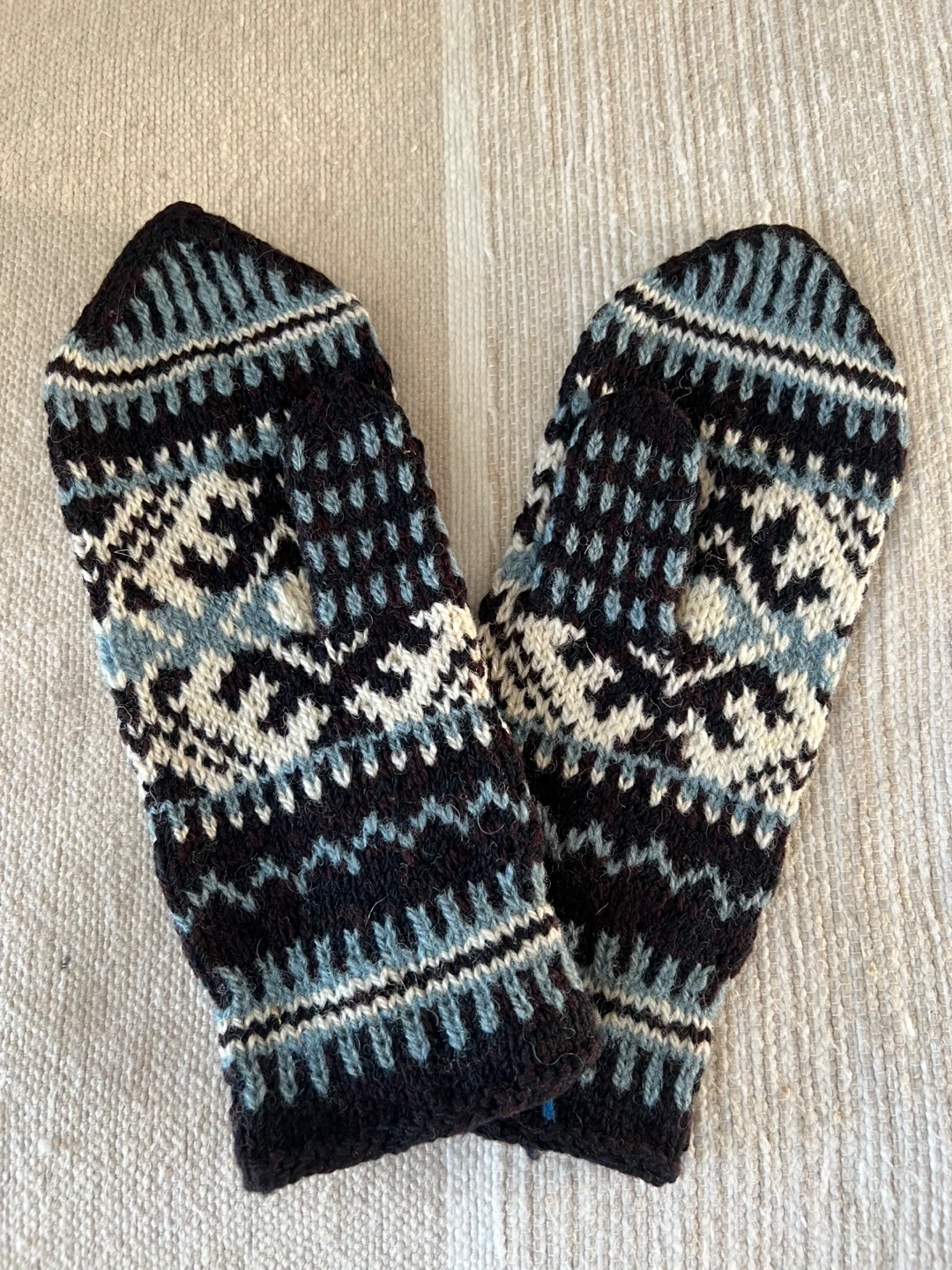 Selling a pair of cozy, handmade wool mittens! They feature a beautiful blue and black pattern. Perfect for keeping your hands warm this winter! Unique gift for the holidays!