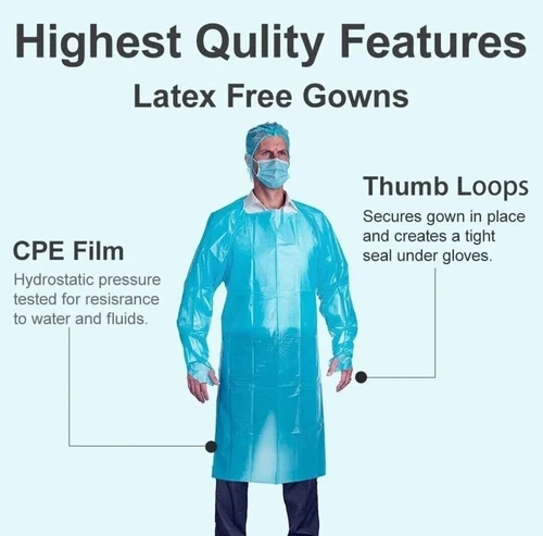 Ideal for a variety of medical, lab, and dental procedures, these gowns are a must-have for healthcare professionals. Don't compromise on safety - choose the trusted quality of Ez Smile Group with these Polyethylene Gowns. Made of a single, lightweight layer of protective polyethylene film with an open back design, this gown provides a high level of protection from fluids and contaminants with the breathability to keep the wearer cool and comfortable on the job. Thumb loop helps keep the gown from riding up arm. Hospital and medical Laboratory Sanitation Food processing Painting