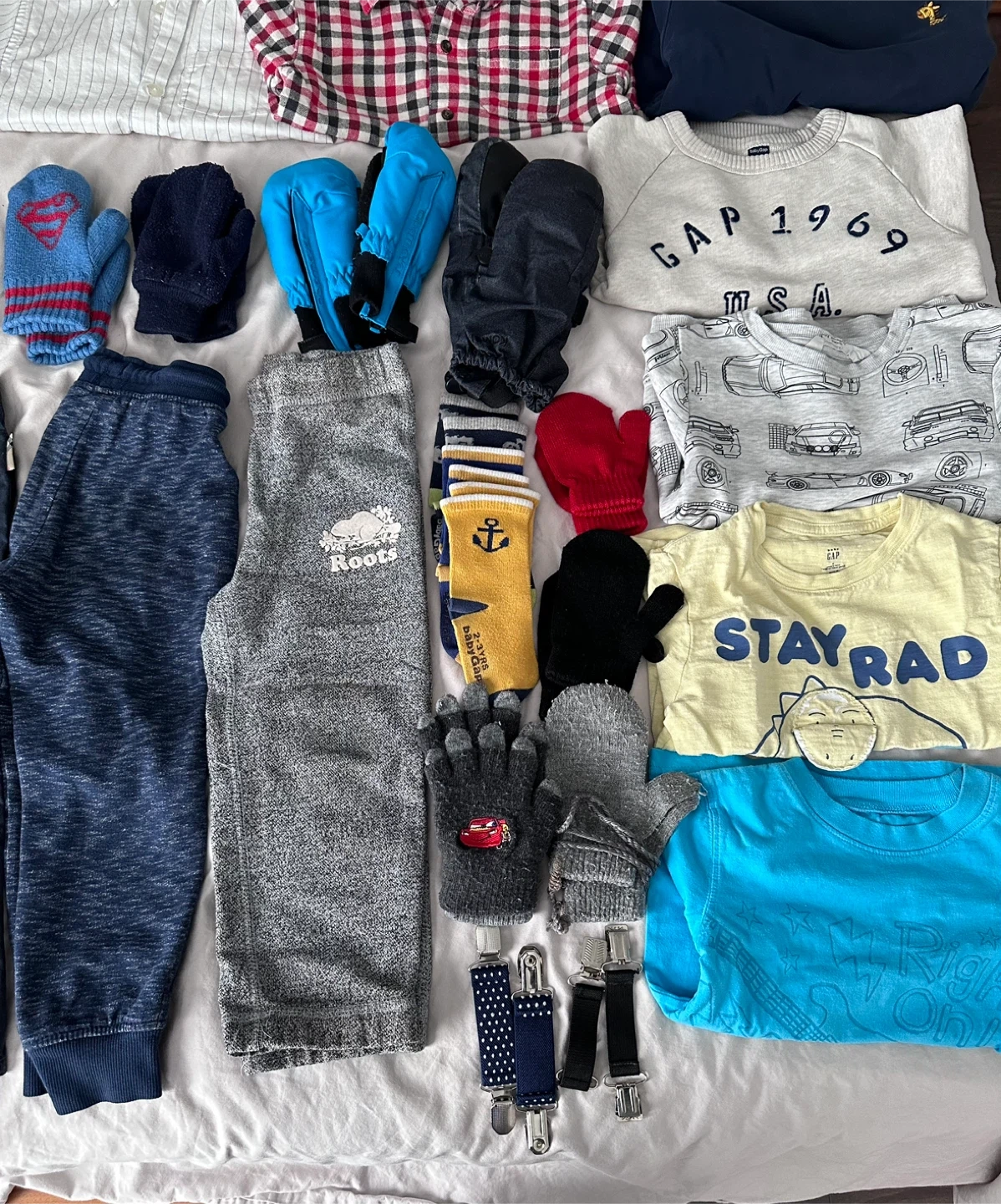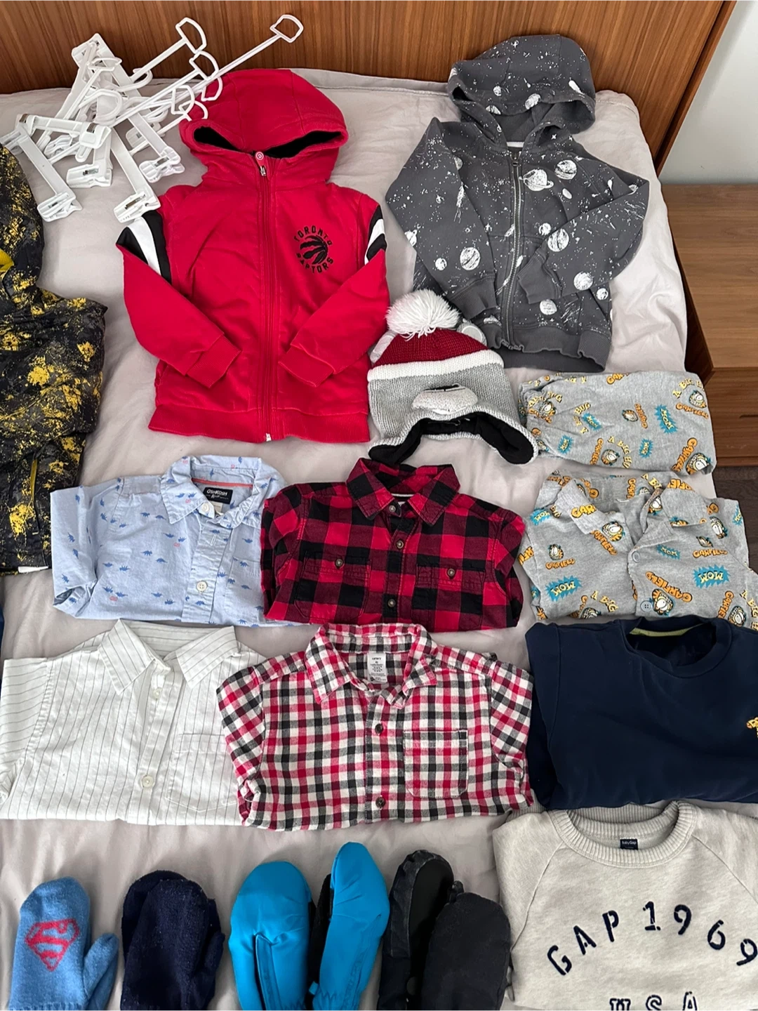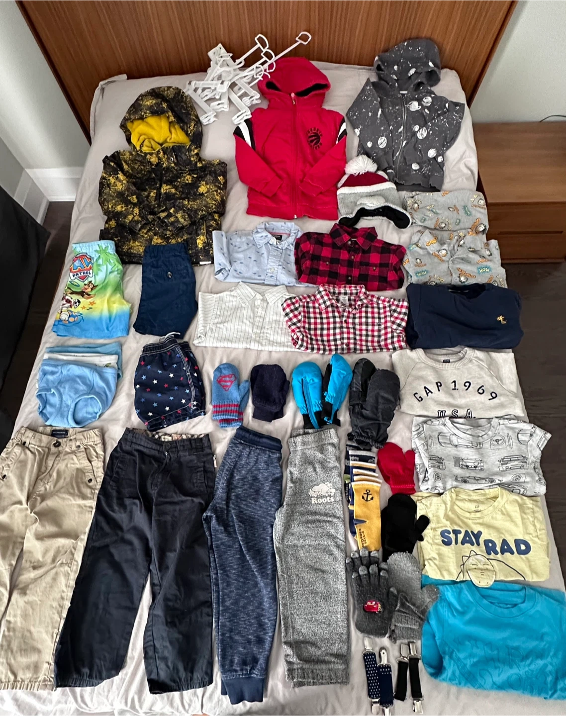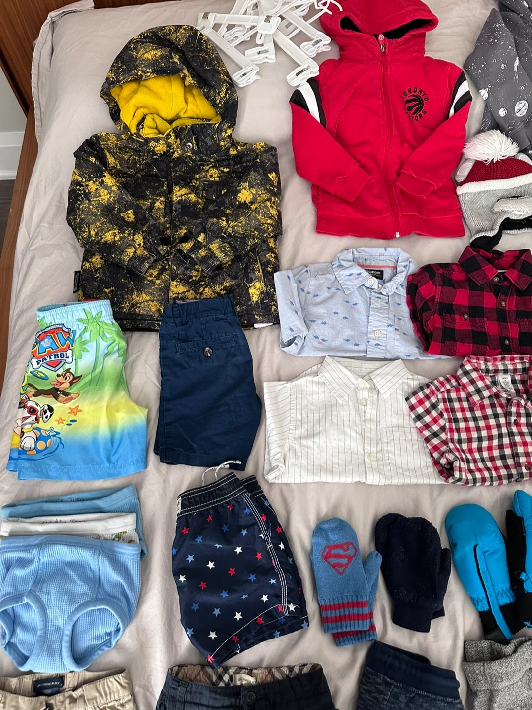 727Lot sale of good condition baby toddler boys clothing items and brands include Burberry, Roots, Gap, baby gap, H&M kids, Carter’s, Zara boys, Nickelodeon, the children’s place, Mountain Warehouse, Joe Fresh, Oshkosh, Paw Patrol, Raptors… - 1 jacket coat - 2 hoodies - 2 swim shorts - 1 pair of shorts - 1 set of PJs (top & bottom) - 4 dress shirts button down - 3 underwear - 3 long sleeve sweatshirts - 2 short sleeves tshirt - 4 pairs of pants - 8 pairs of mitts/ gloves - 2 pair of mitt gloves clips - 3 pairs of socks - 1 bear winter hat