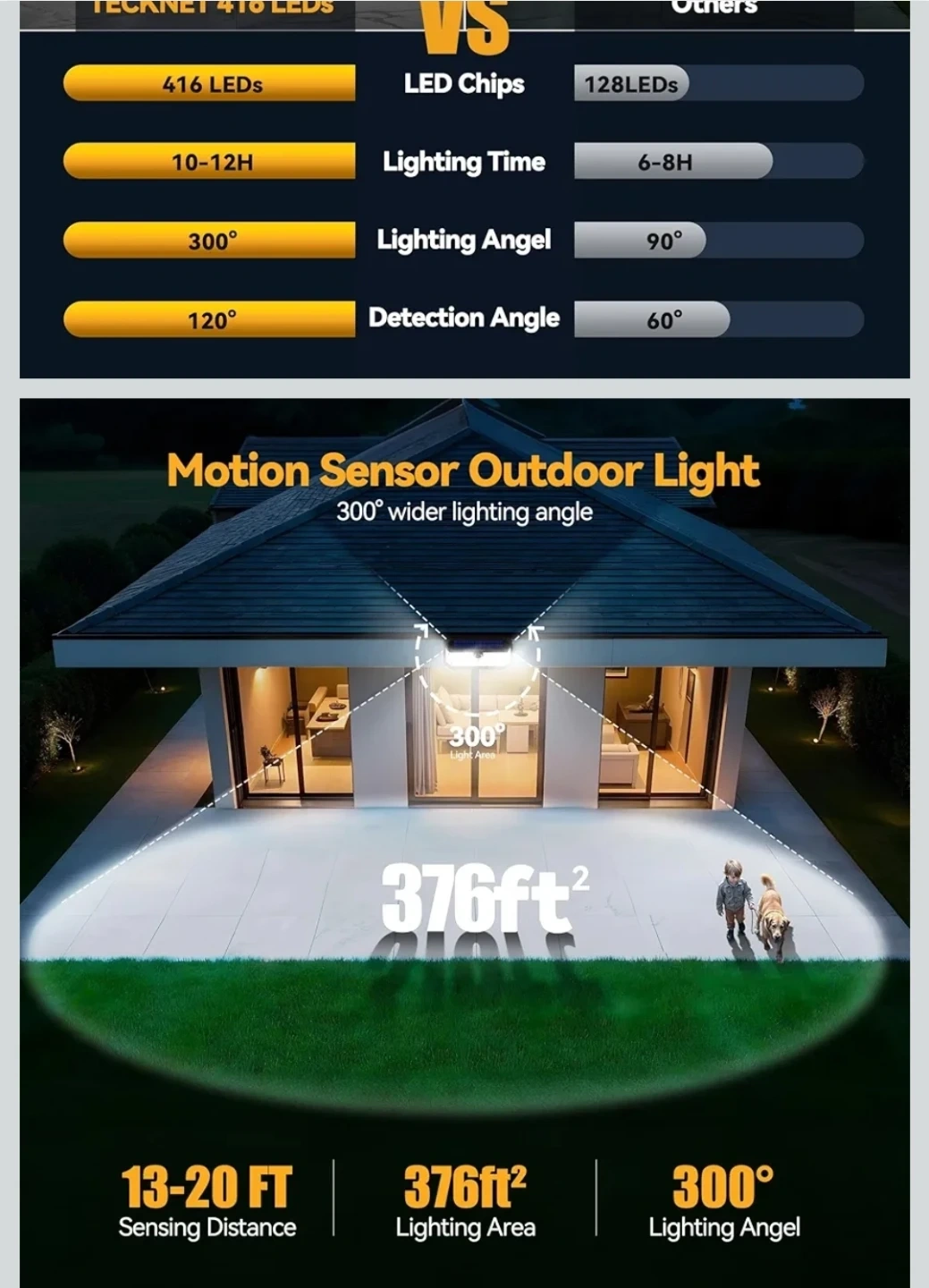 New never used TECKNET 4200Lm Solar Lights Outdoor, [416 LED/3-Sided Lighting] Motion Sensor Light Outdoor, 3 Modes Outdoor Solar Lights, IP66 Solar Lights Outdoor Waterproof, 300°Lighting Angle for Yard Garden Deck
