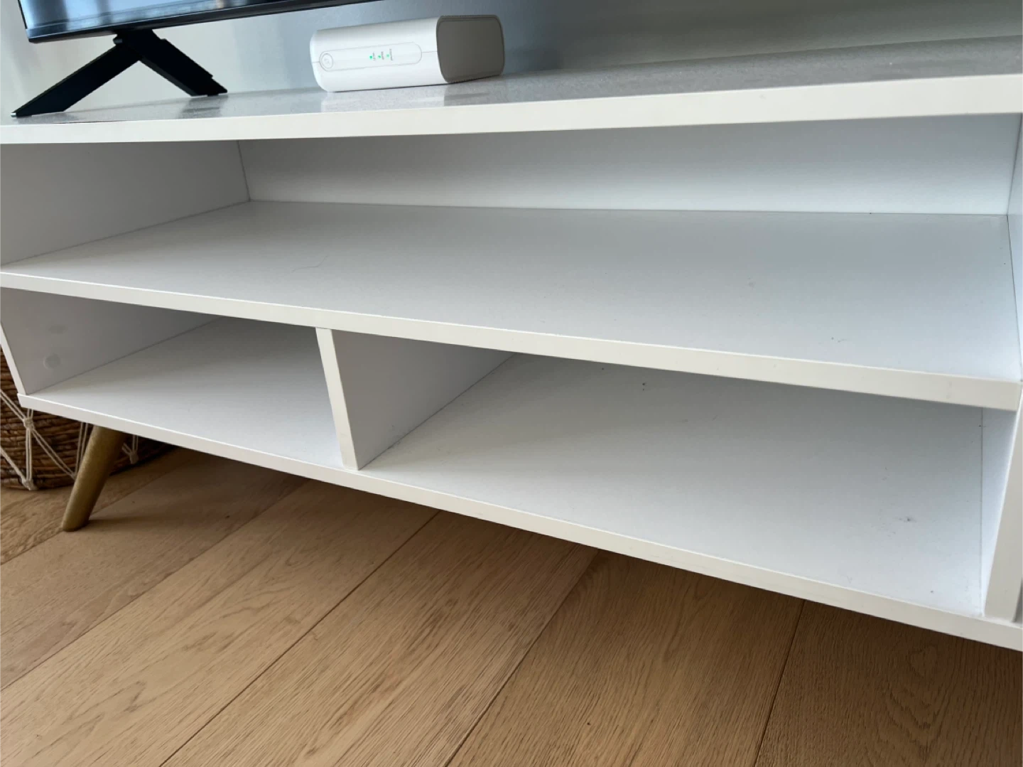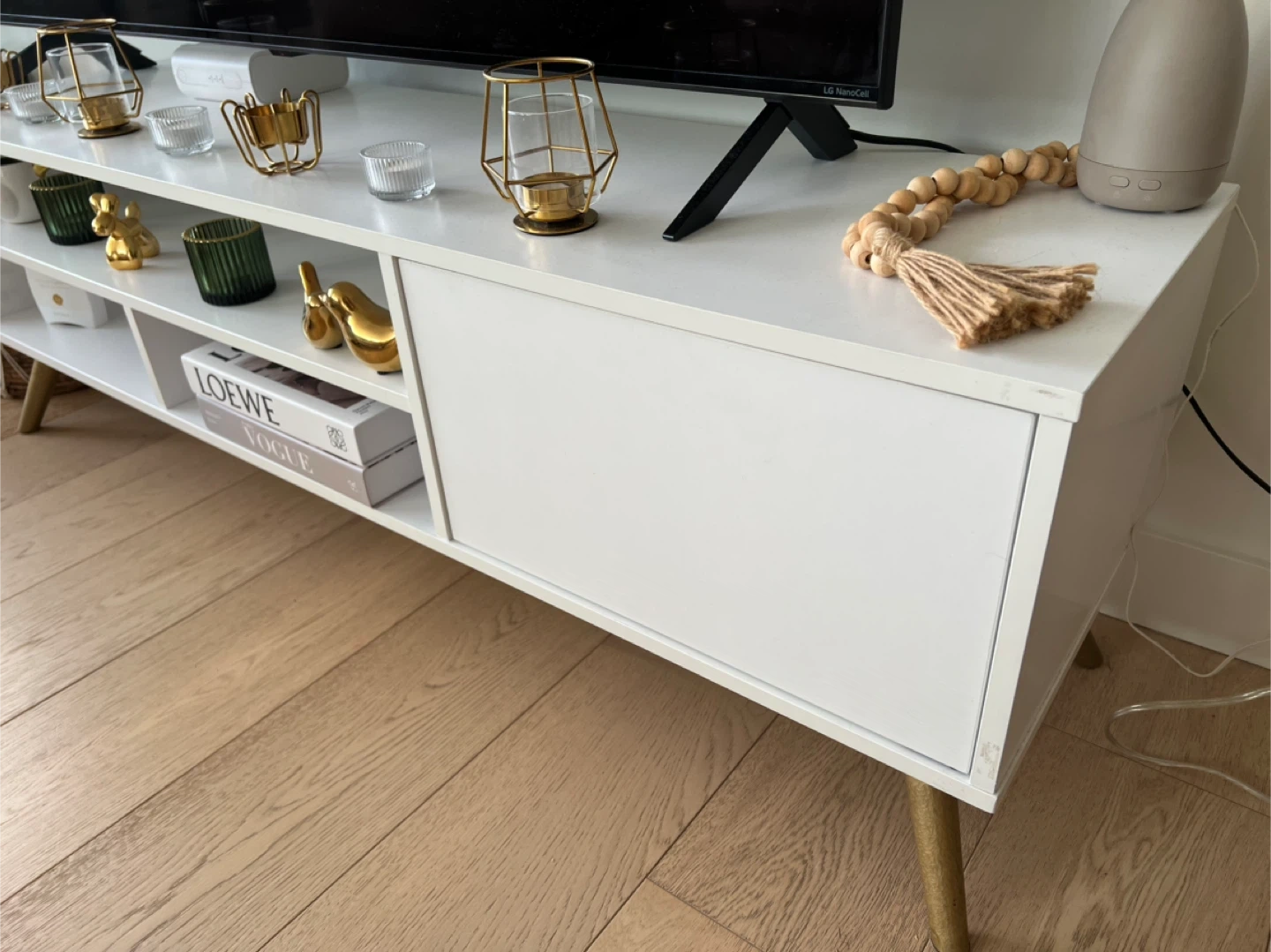 Selling a stylish white TV stand. It features open shelving and a cabinet with a door, perfect for storing your media and accessories. The gold-tone legs add a touch of elegance to any living space.