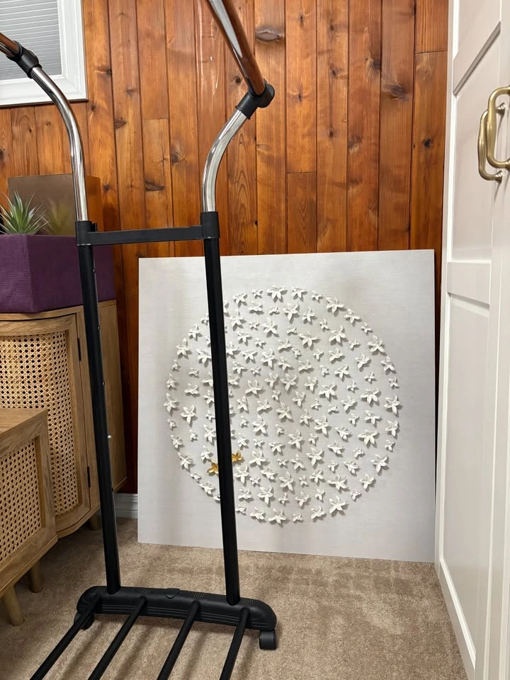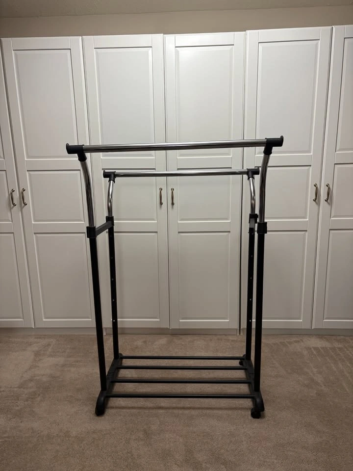 Selling a 2-tier adjustable rolling rack/clothing rack. The one piece has become disconnected, but it doesn't impact function at all and could be super-glued to stay put. Asking $10 cash only.