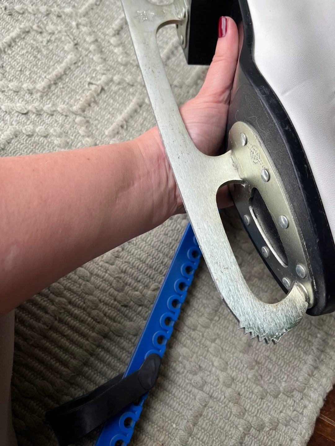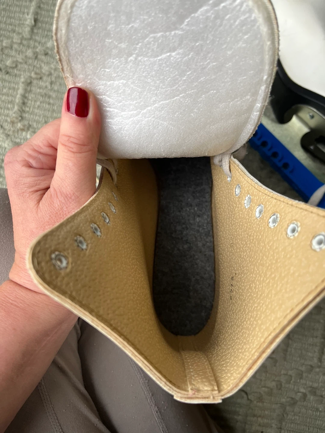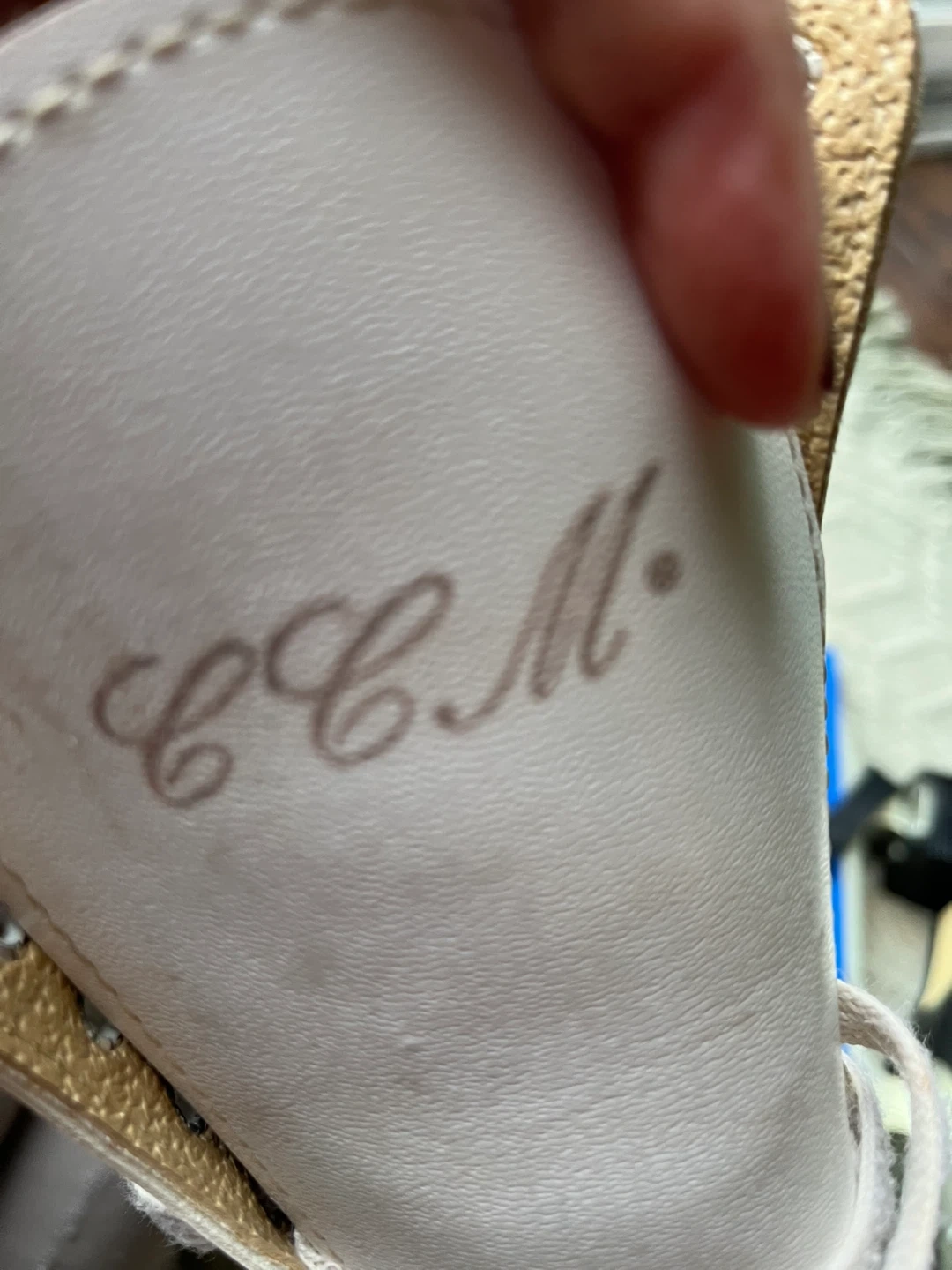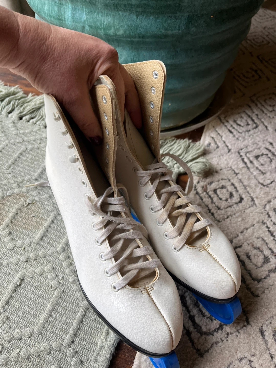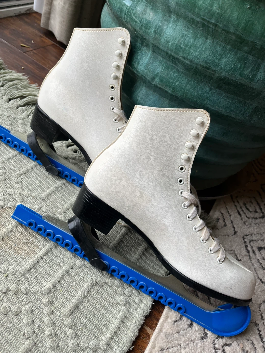 Selling a pair of size 9 CCM figure skates in white. They show some signs of use on the blades and can be sharpened, but are otherwise in good condition. Great for recreational skating!