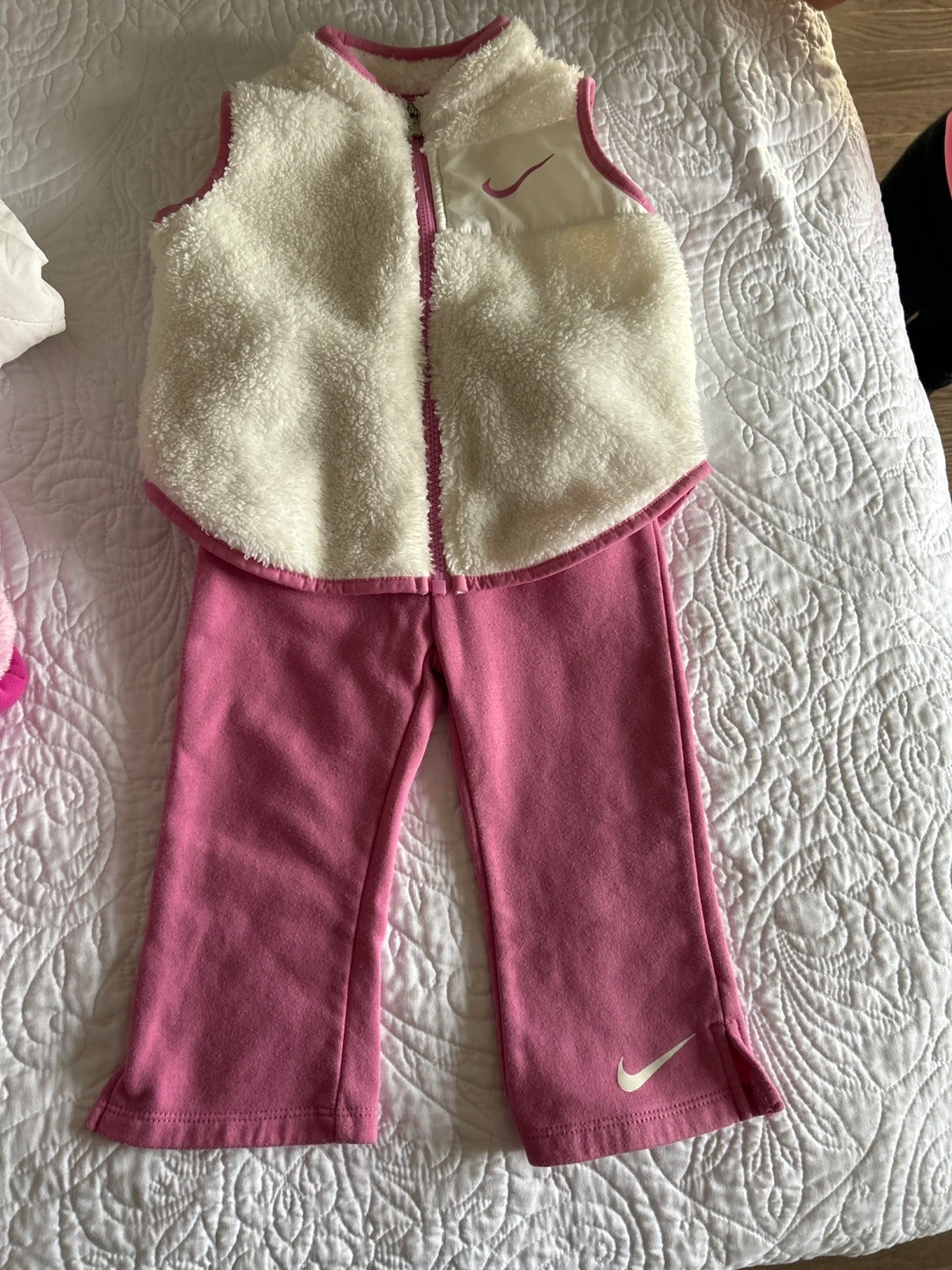 This adorable Nike set includes a cozy white sherpa vest with pink trim and matching pink pants! The Nike swoosh is visible on both the vest and pants. Perfect for keeping your little one warm and stylish!