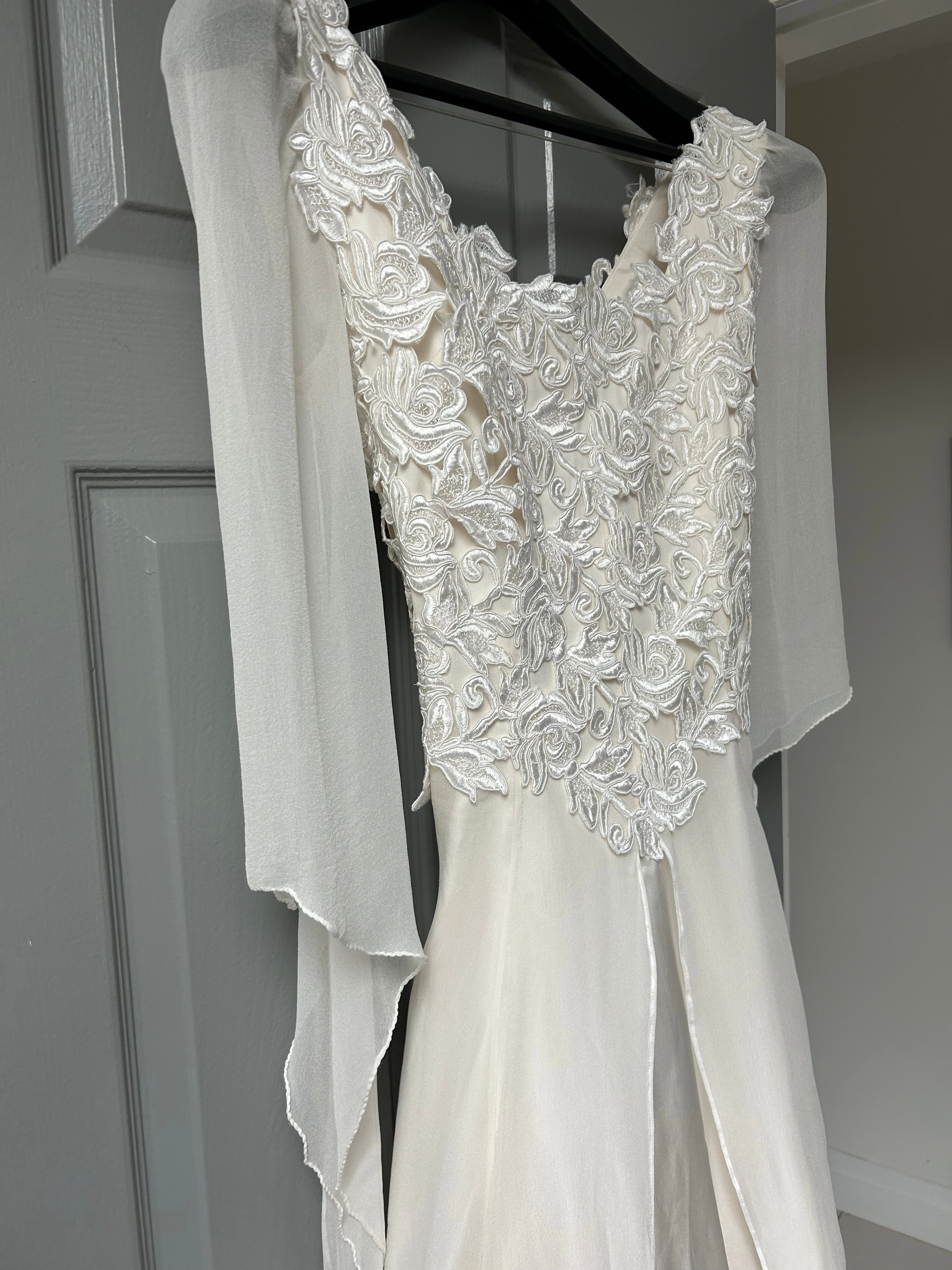 Brides, come try it on--happy to let you assess your wedding dress live! Custom made wedding dress, lace, silk, chiffon, paid $5000 would cots $8000++ today to get made. Bride was size 8, can alter to size 6-10. Off white, lace bodice, sheer flowing layer on skirt & arms. Buttons up back, so this is where seam can be adjusted. Bit wrinkled in photo--needs to be steamed. All offers considered. Tell me your wedding story, l will sell you my dress!