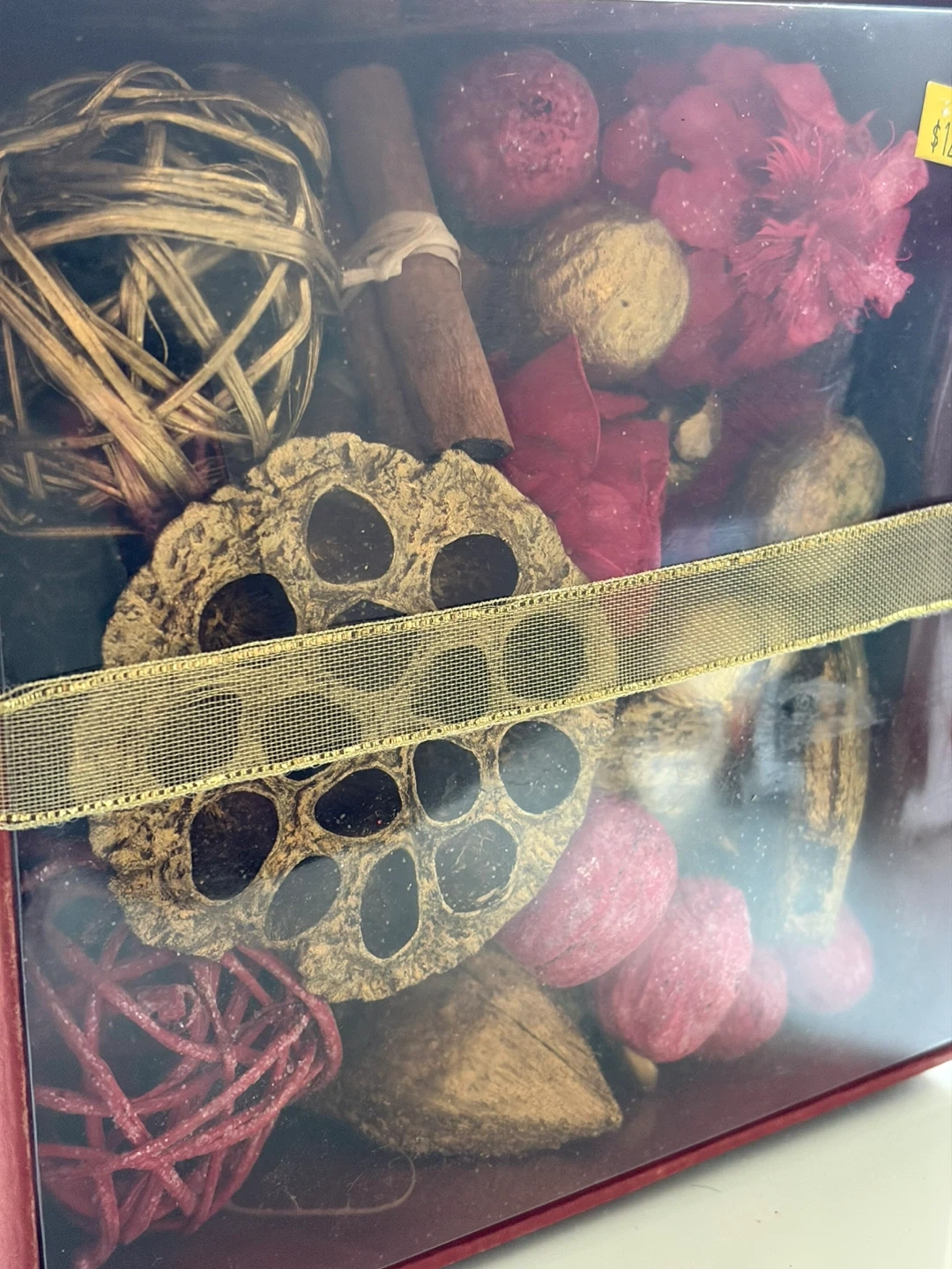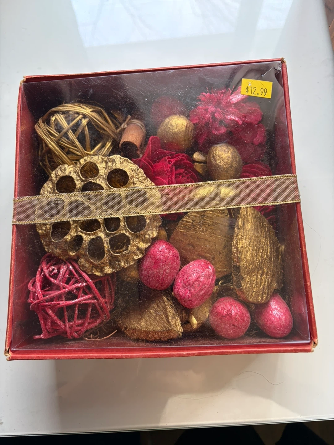 Selling a potpourri box. It has a mix of dried flowers, cinnamon sticks, and decorative balls. The box is red and clear, tied with a gold ribbon. The original price was $12.99