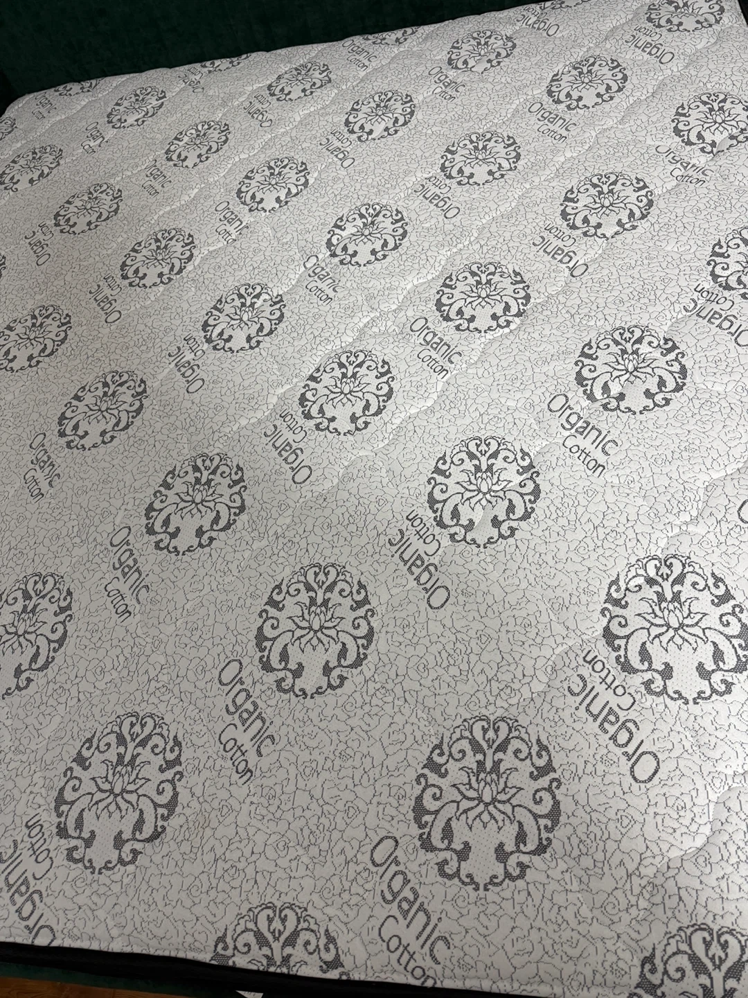 This is an organic cotton mattress. It's in great condition and ready for a new home! The mattress features a lovely pattern of organic cotton designs across the top.