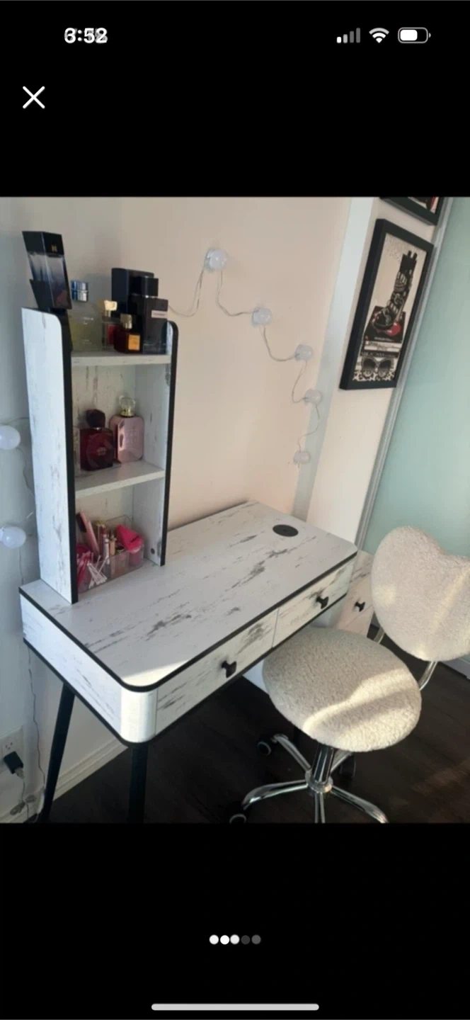 Selling a cute white marble vanity desk! It comes with shelves for extra storage and a sleek design that would look great in any room