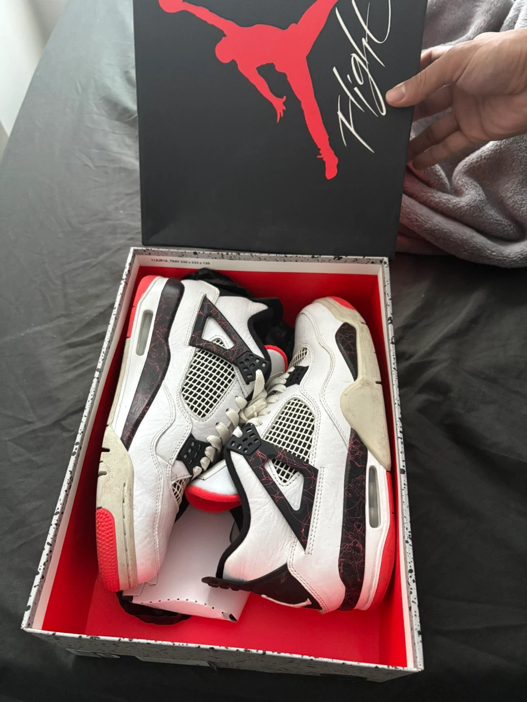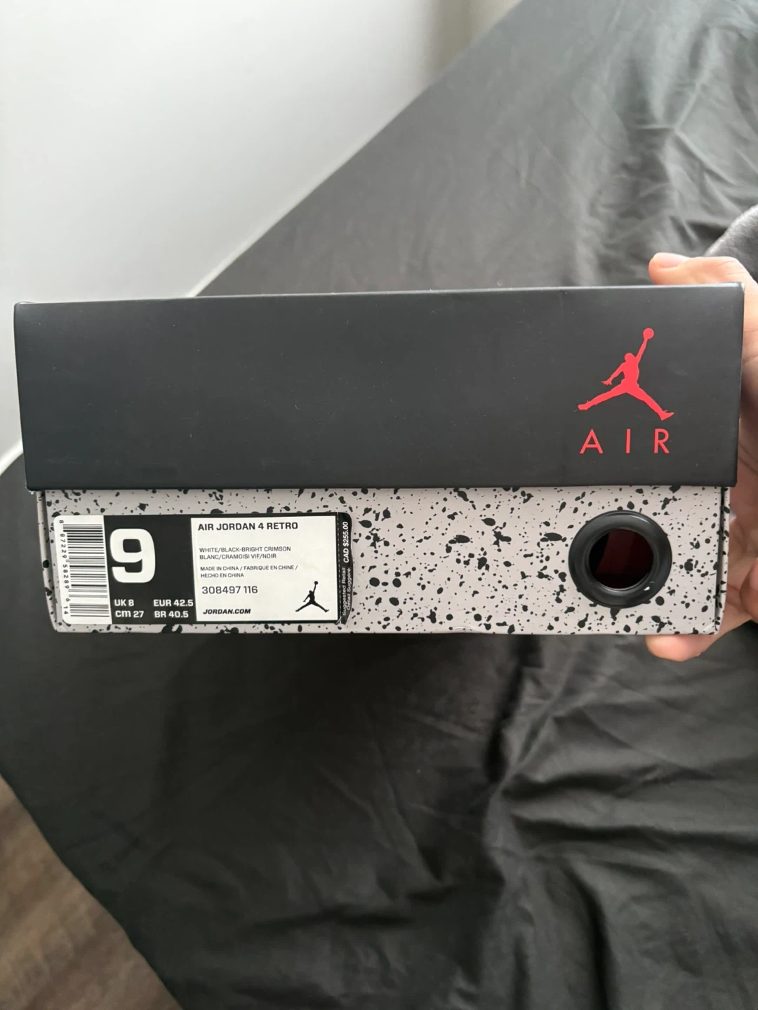 Selling a pair of Air Jordan 4 Retro sneakers in size 9. The colourway is White/Black/Bright Crimson. Comes with the original box.