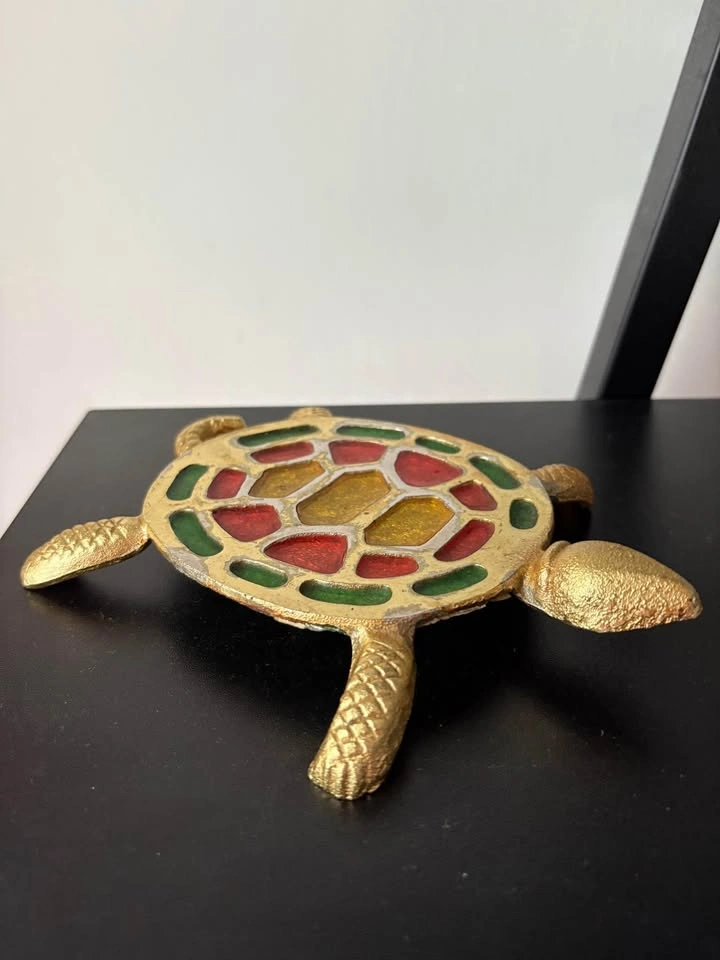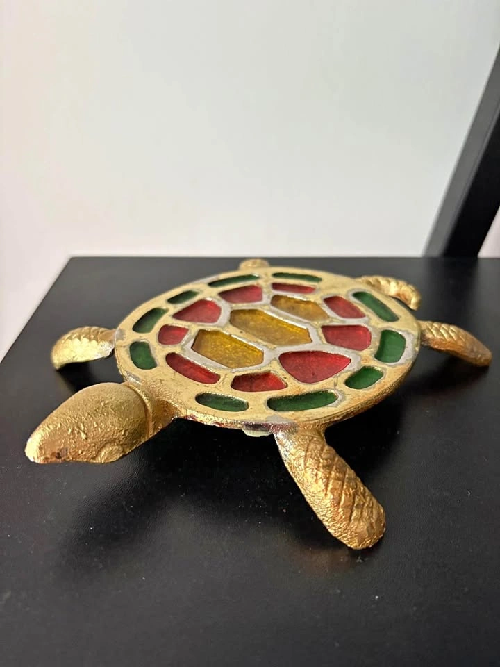 Vintage Turtle Trivet Colorful Metal with Stained Glass Inlay