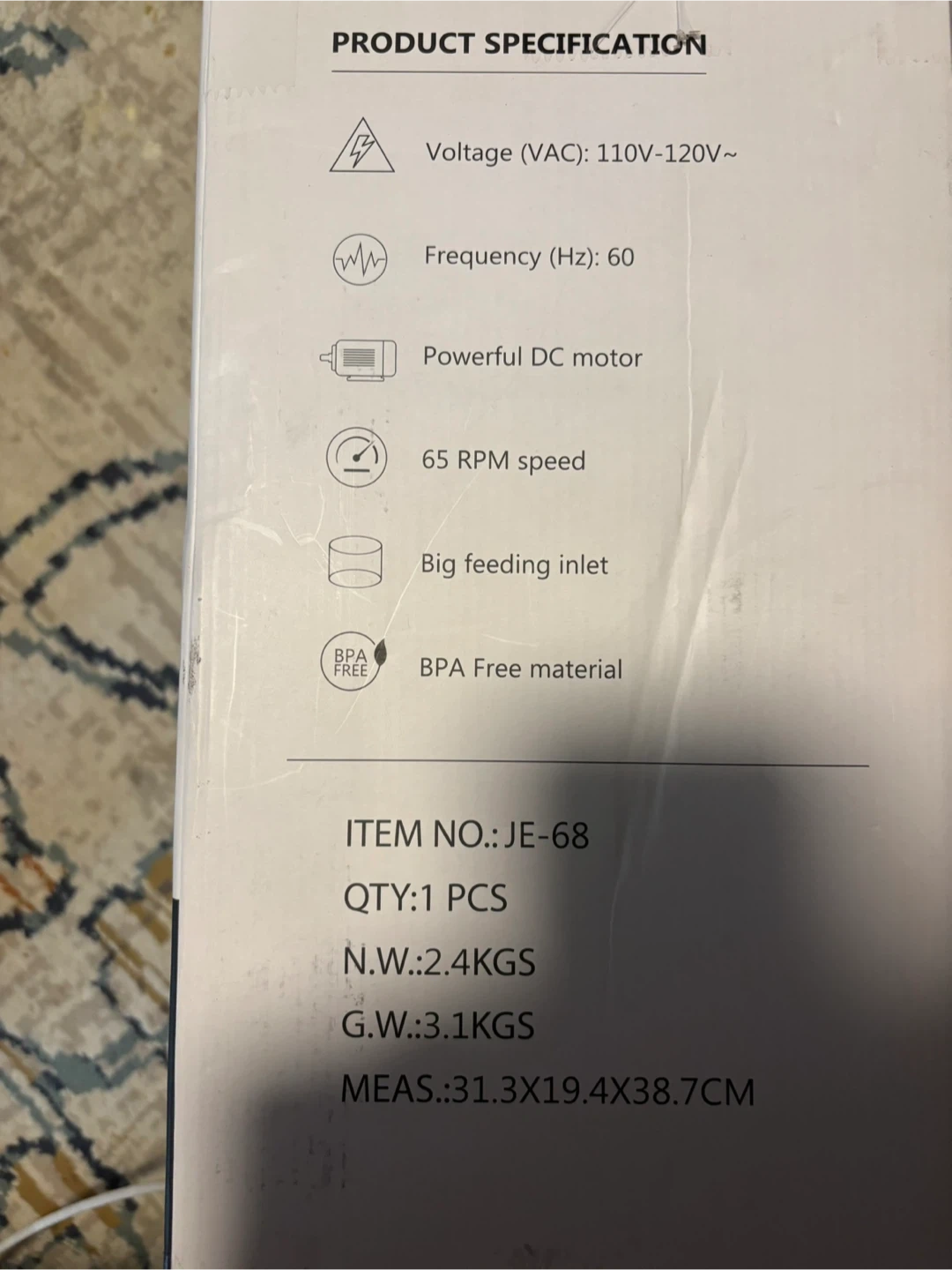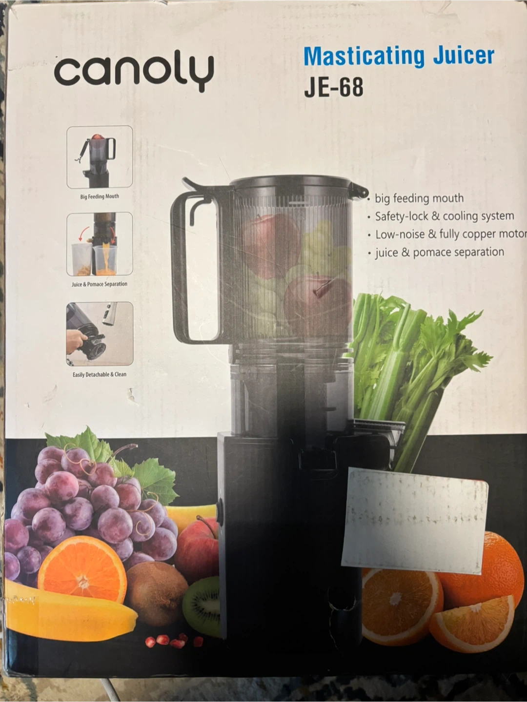 Selling a Canoly Masticating Juicer, model JE-68. It features a big feeding mouth, safety-lock & cooling system, and a low-noise & fully copper motor. It also has juice & pomace separation and is easily detachable & clean. The product specifications include a voltage of 110V-120V, a frequency of 60Hz, and a powerful DC motor with a 65 RPM speed. It's BPA free and the dimensions are 31.3 x 19.4 x 38.7 cm