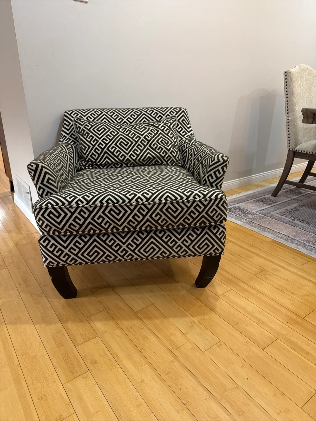Looking to sell this armchair with a matching cushion! It has a unique patterned design in black and white. It's in great condition and would be a stylish addition to any living room or bedroom. Feel free to message me if you're interested!r
