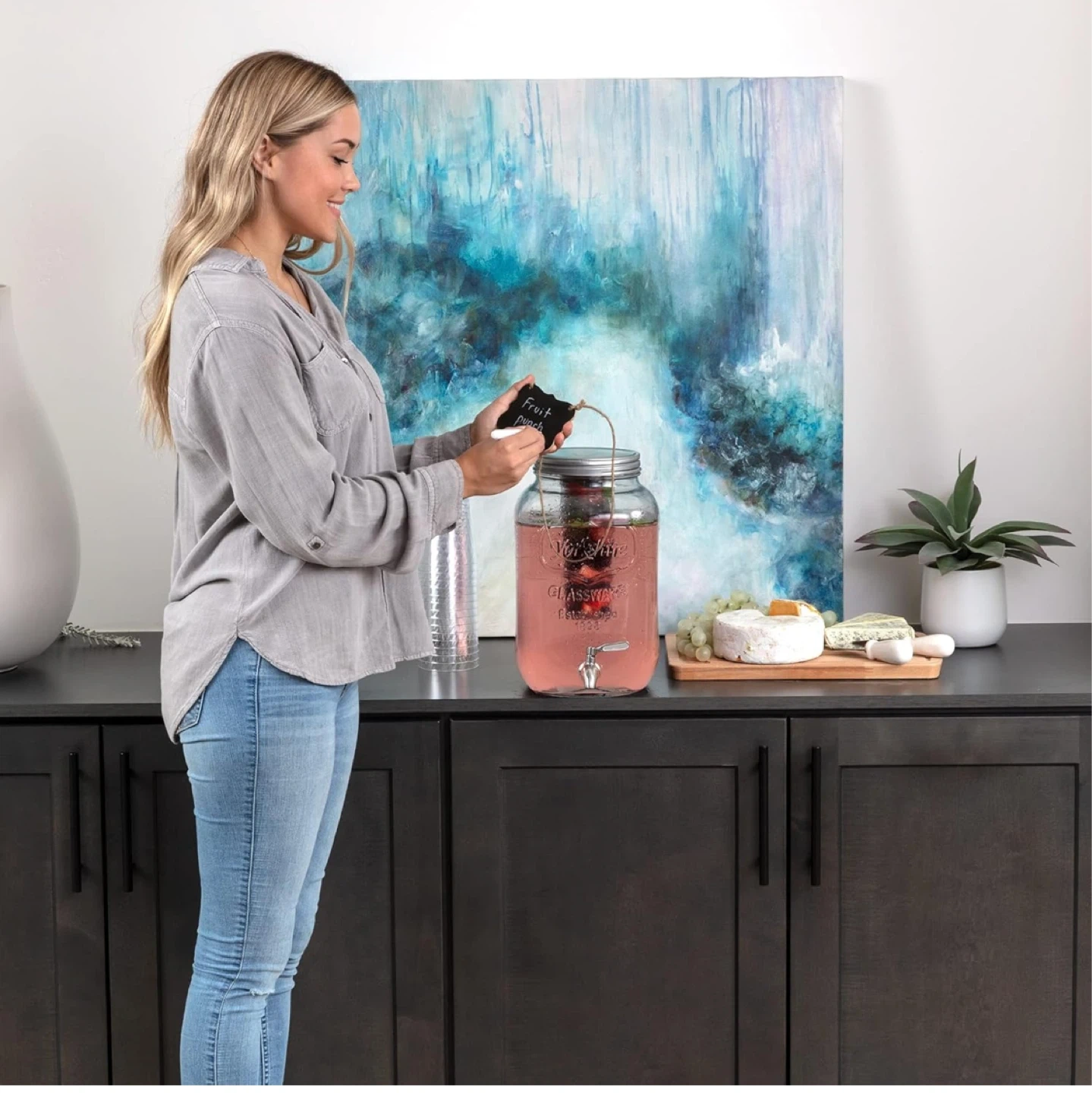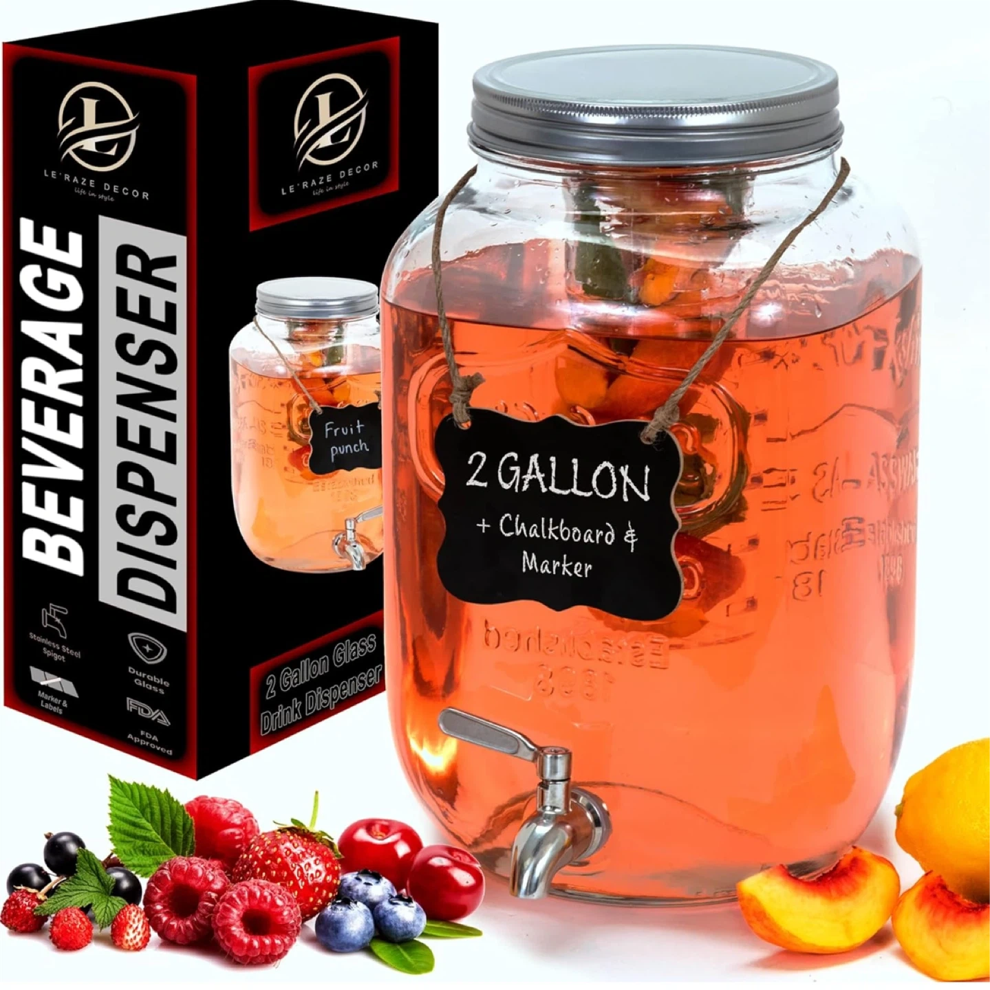 This is a 2-gallon glass drink dispenser from Le Raze Decor! It comes with a chalkboard and marker so you can label your beverages. Perfect for parties or everyday use!