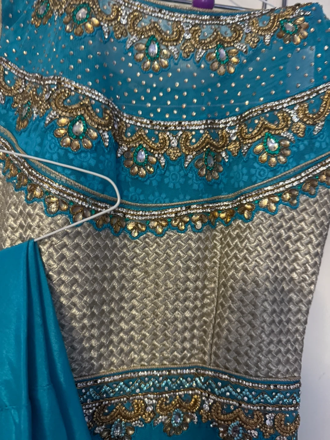 Selling a beautiful teal and gold Indian outfit. It features intricate embroidery and a lovely design. Perfect for special occasions or cultural events!size is 40 - it is good for small or medium
