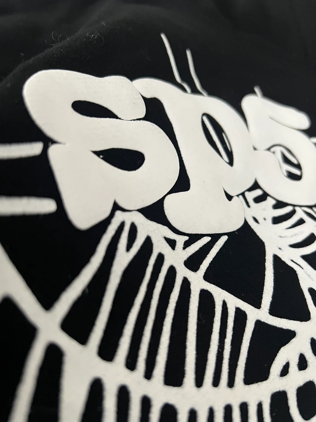 1:1 Selling a black SP5DER hoodie! It features a white spiderweb design on the front and stars on the sleeves. It's in great condition and ready for a new home