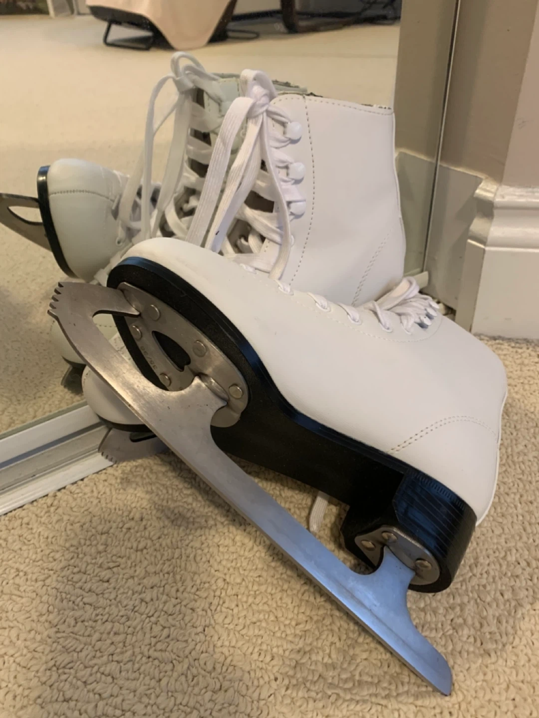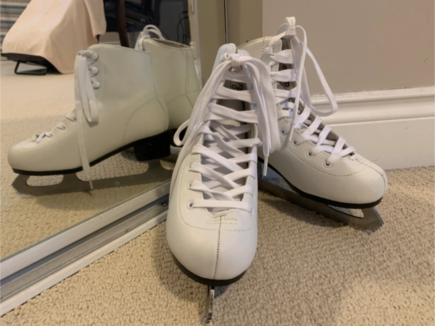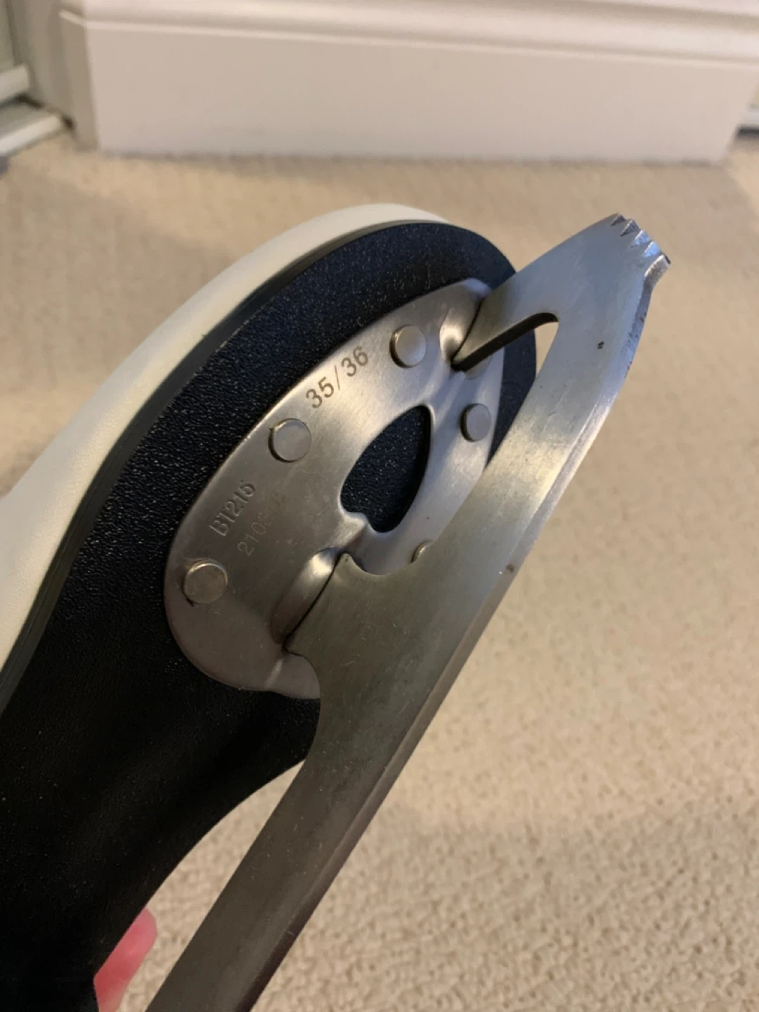 27Selling a pair of ice skates. They're white and appear to be in good condition. The size is marked as 35/36.