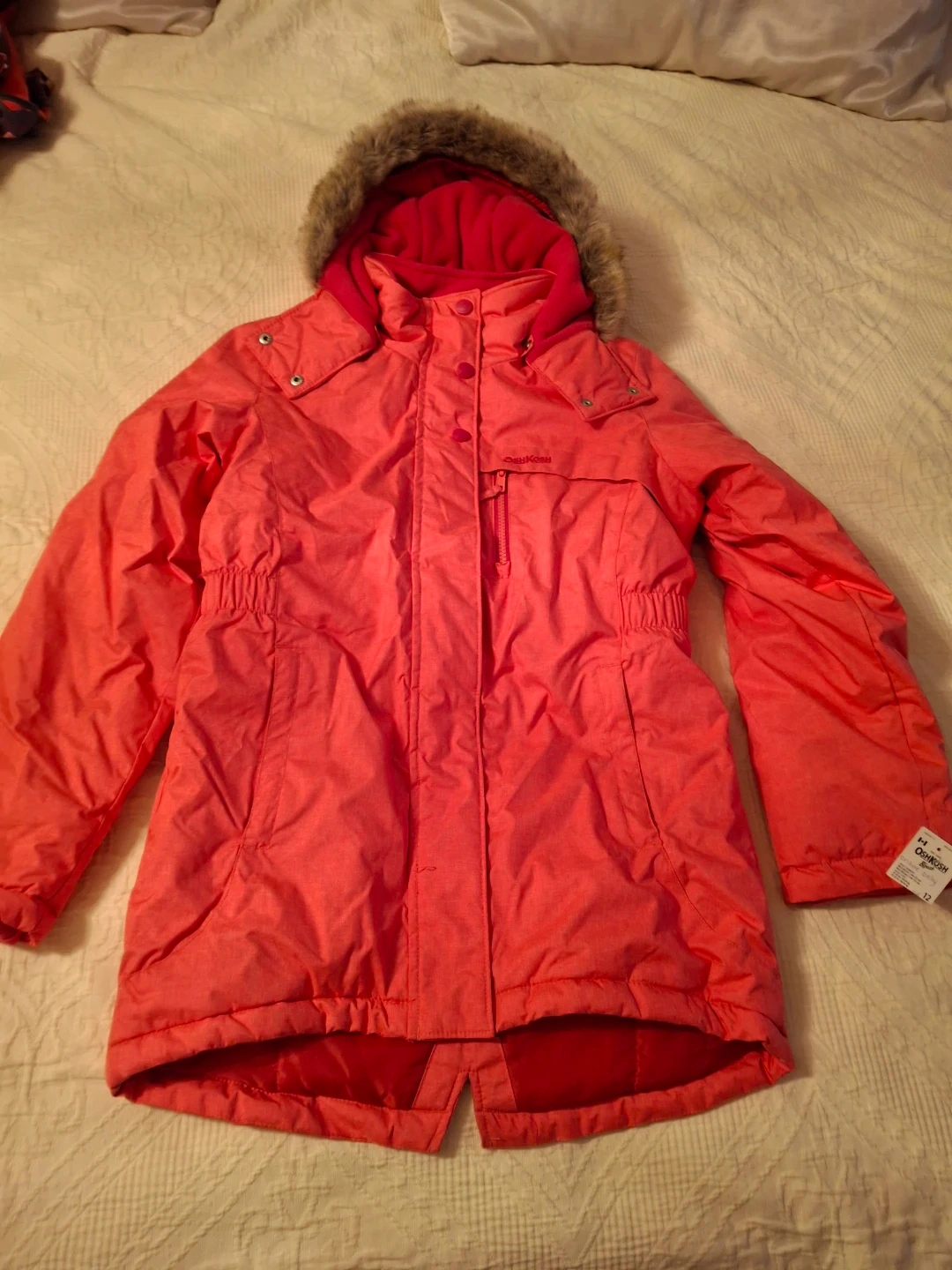 This is a brand new OshKosh B'gosh winter jacket for girls, size 12! It's a lovely pink colour with a warm, fur-trimmed hood and a cozy red fleece lining. Perfect for keeping your little one snug and stylish during the cold Canadian winters