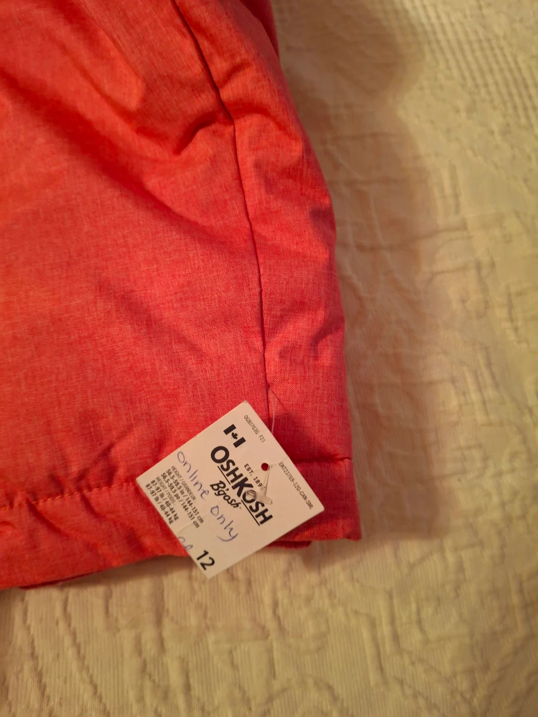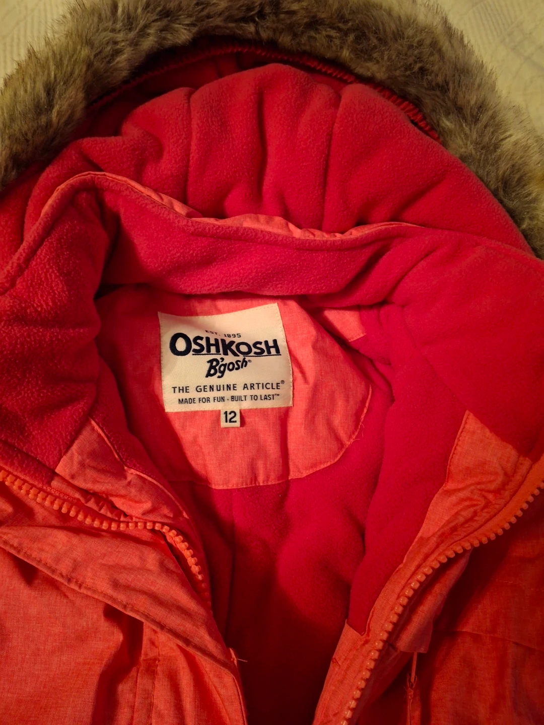 This is a brand new OshKosh B'gosh winter jacket for girls, size 12! It's a lovely pink colour with a warm, fur-trimmed hood and a cozy red fleece lining. Perfect for keeping your little one snug and stylish during the cold Canadian winters