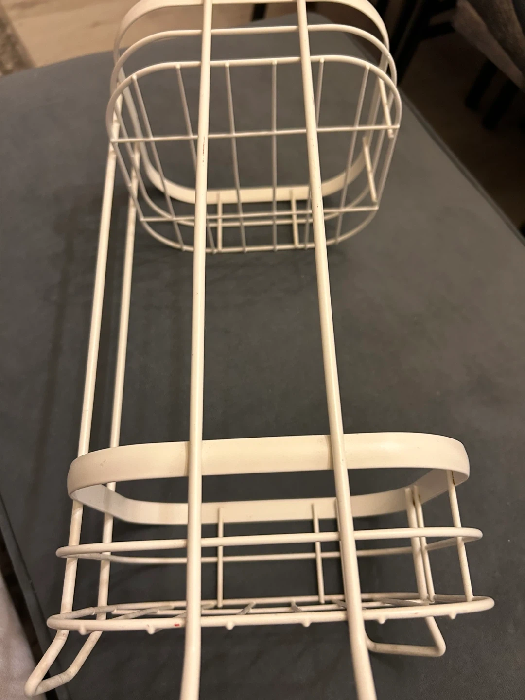Here's a handy white metal storage shelf! It's perfect for organizing items in your bathroom, kitchen, or any space that needs a little tidying up. It has two tiers, providing ample storage without taking up too much room. It's in great condition and ready for a new home
