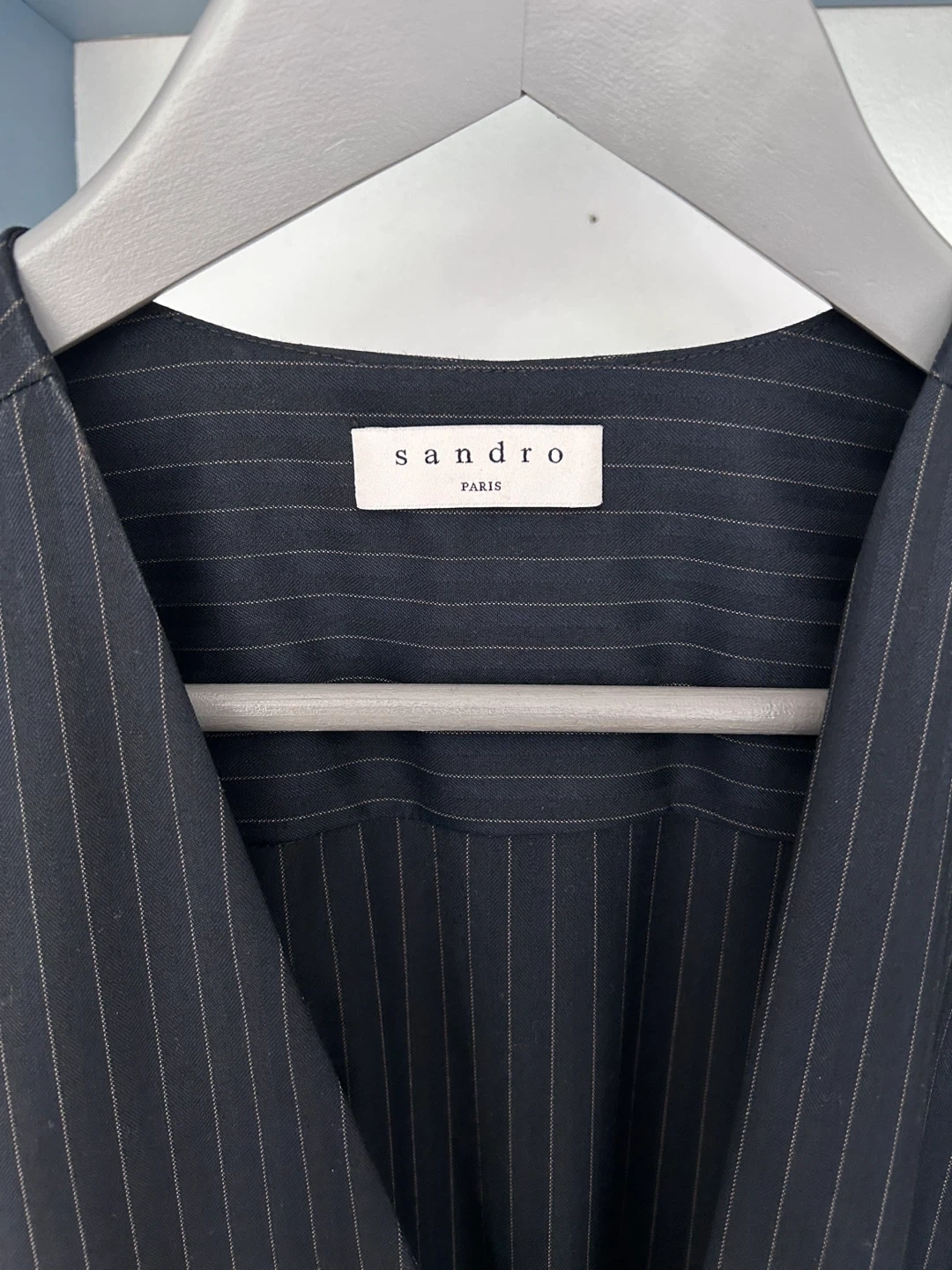 65This is a Sandro Paris dress in a pinstripe pattern. It features long sleeves with elasticated cuffs and gold-toned buttons. The dress has a V-neck and a cinched waist.