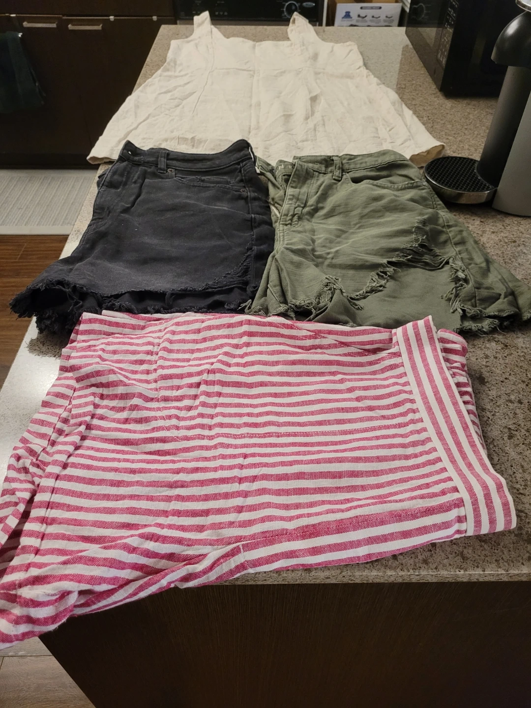 Selling a bundle of clothes in good condition! Included is an Old Navy linen blend top in size XL and TWO American Eagle denim shorts in size 12. The shorts have a comfort stretch waistband. Perfect for your summer wardrobe!