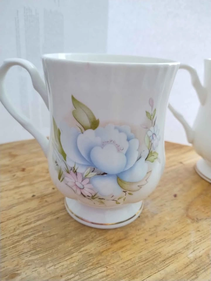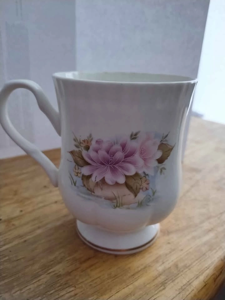 10$5 each One is a fine bone China mug with blue and pink flowers. One is a fine bone China mug with purple and pink flowers. No Cracks, No Chips, Discolouration due to tea stains. Pickup at Main Street Subway Station or Danforth GO Station.