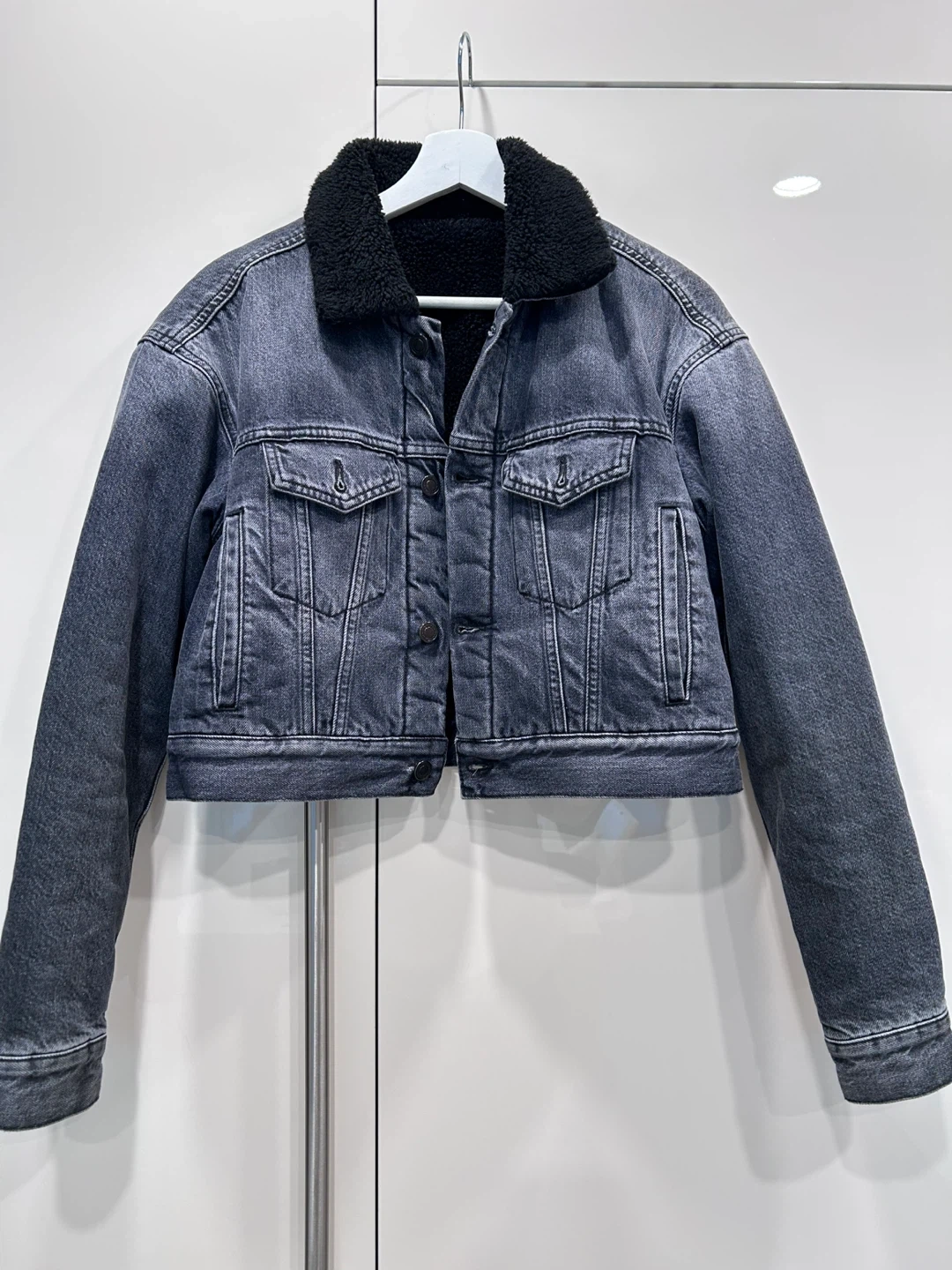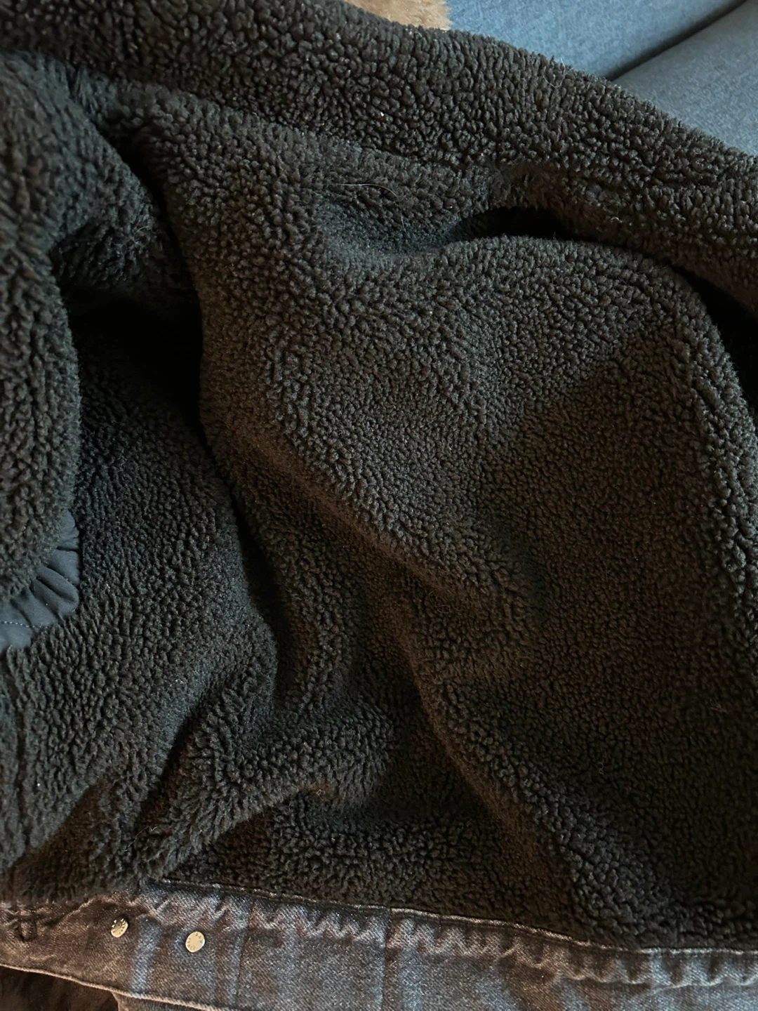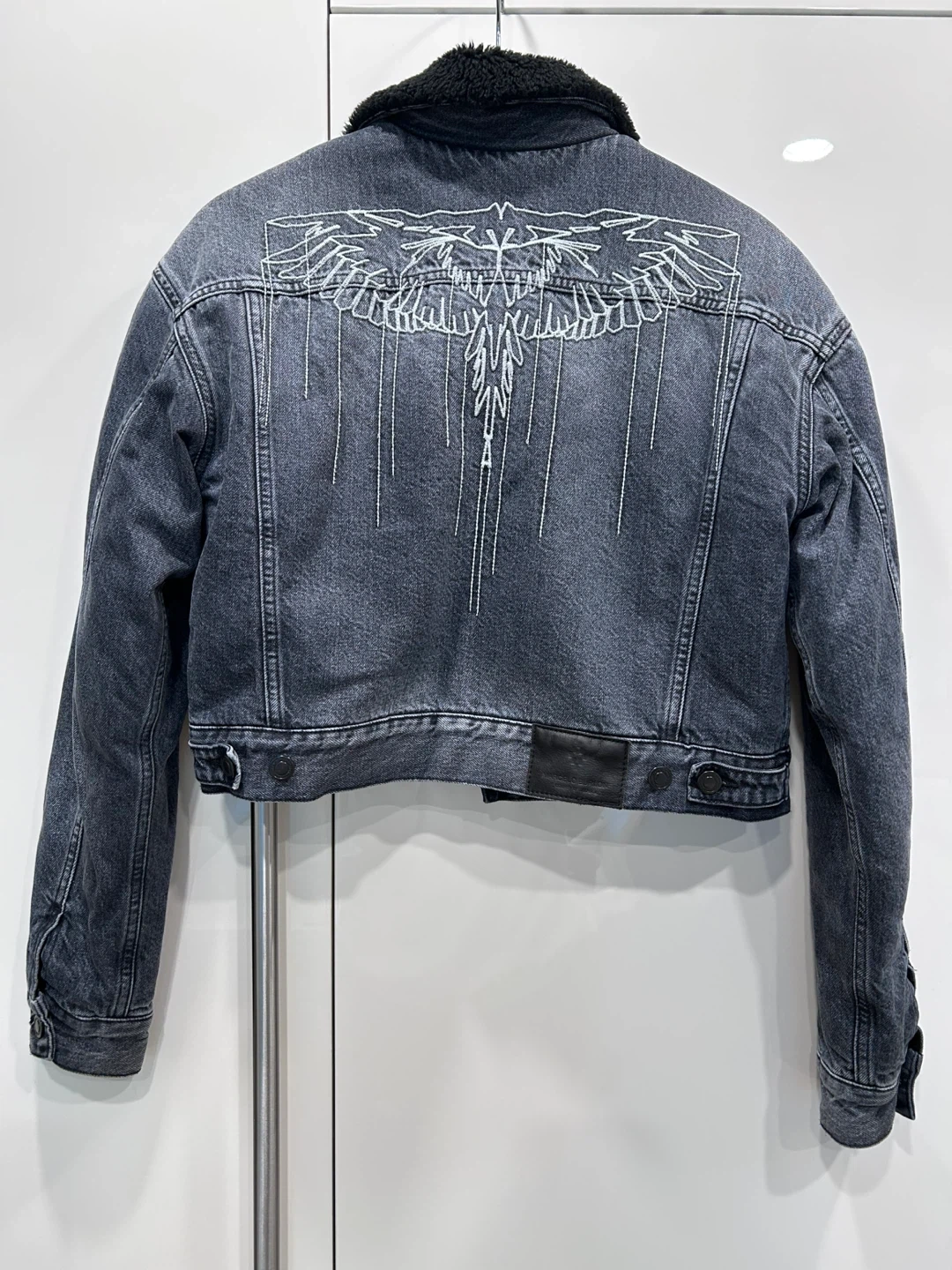 Selling a Marcelo Burlon denim jacket in size XS. It's a stylish jacket with a unique design on the back and a cozy sherpa lining. Perfect for adding a bit of edge to your wardrobe!