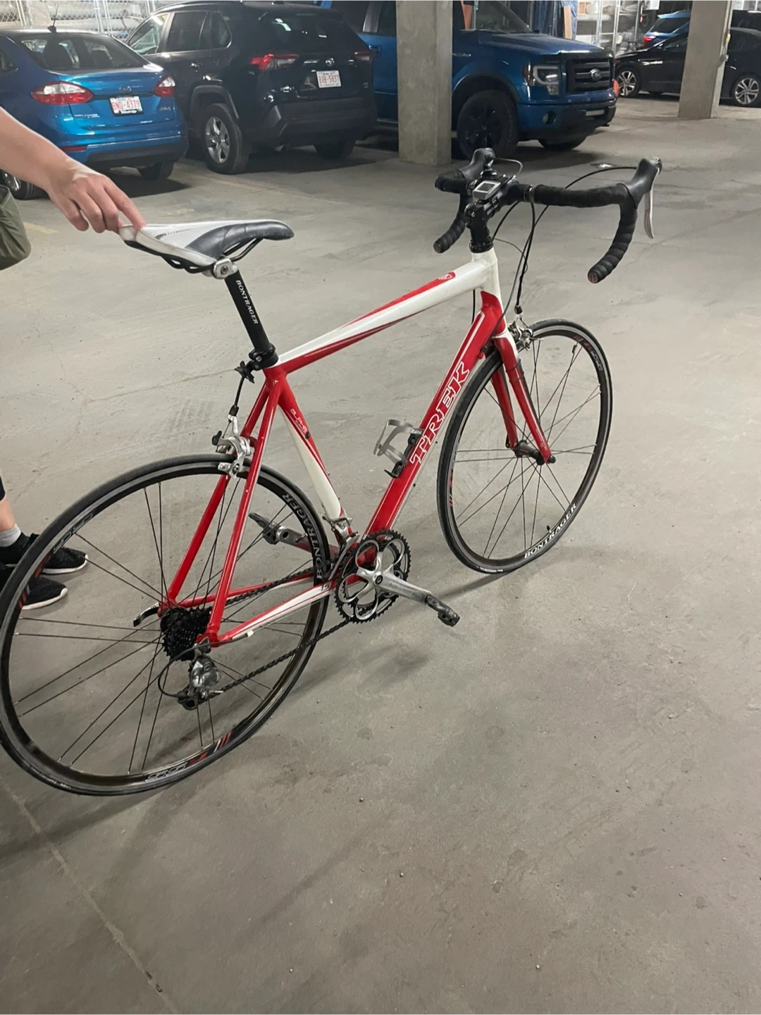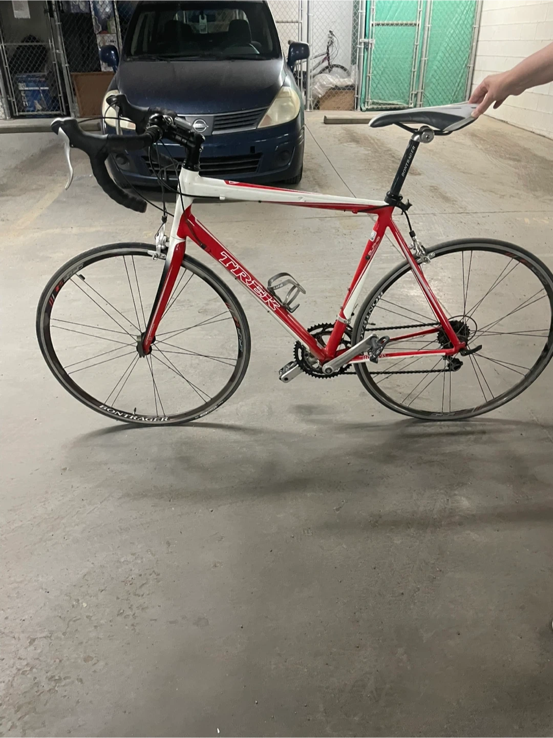 Selling a Trek road bike in red and white. It's in good condition and ready to ride! The tires are Bontrager. Size is 58.