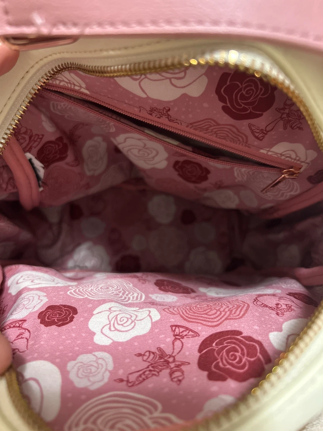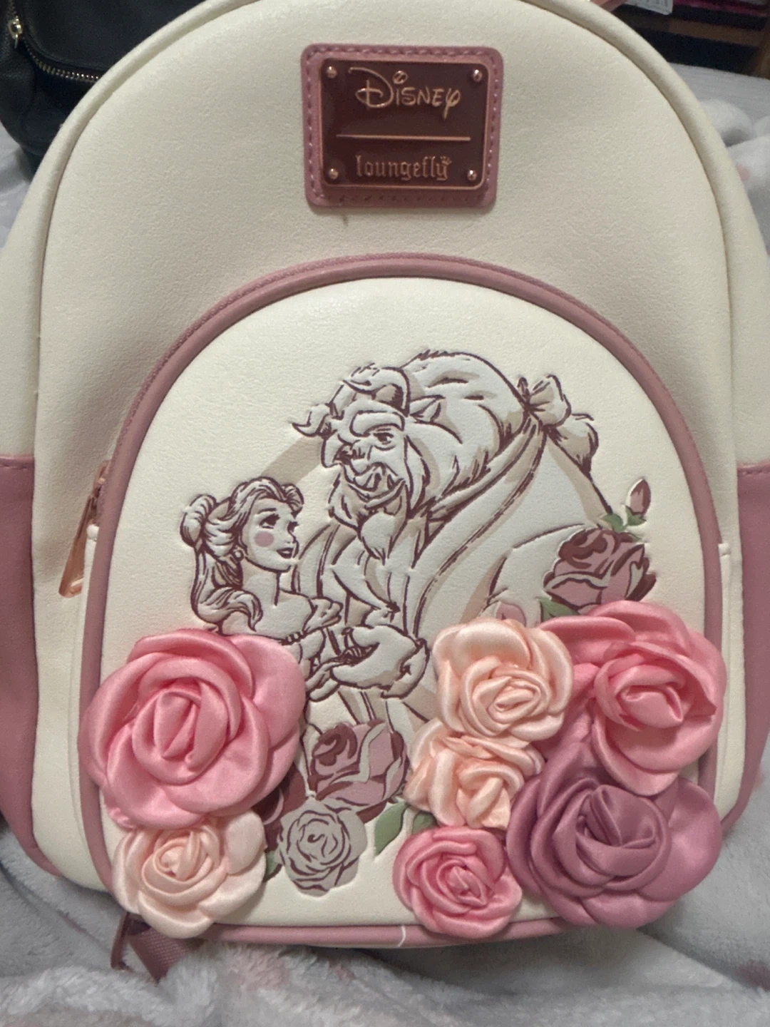 This is a New super cute Disney Loungefly backpack featuring Beauty and the Beast! It has a floral design with pink and cream colours. The inside has a rose pattern. Perfect for any Disney fan!