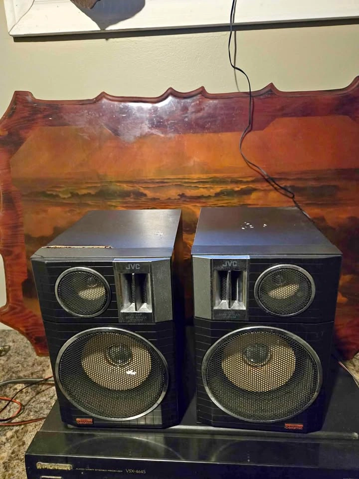 These are a set of used JVC Speakers that deliver crisp audio. While they show signs of wear, including a chip on one speaker, they function perfectly, ready to amplify your listening experience.